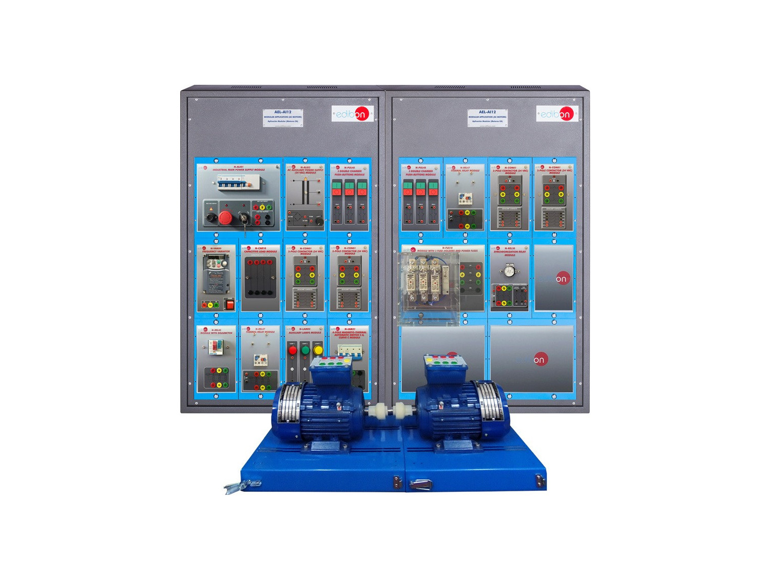 The Modular Application (AC Motors), "AEL-AI12", has been designed by EDIBON in order to instruct the students about the most important operations of alternating current motors.