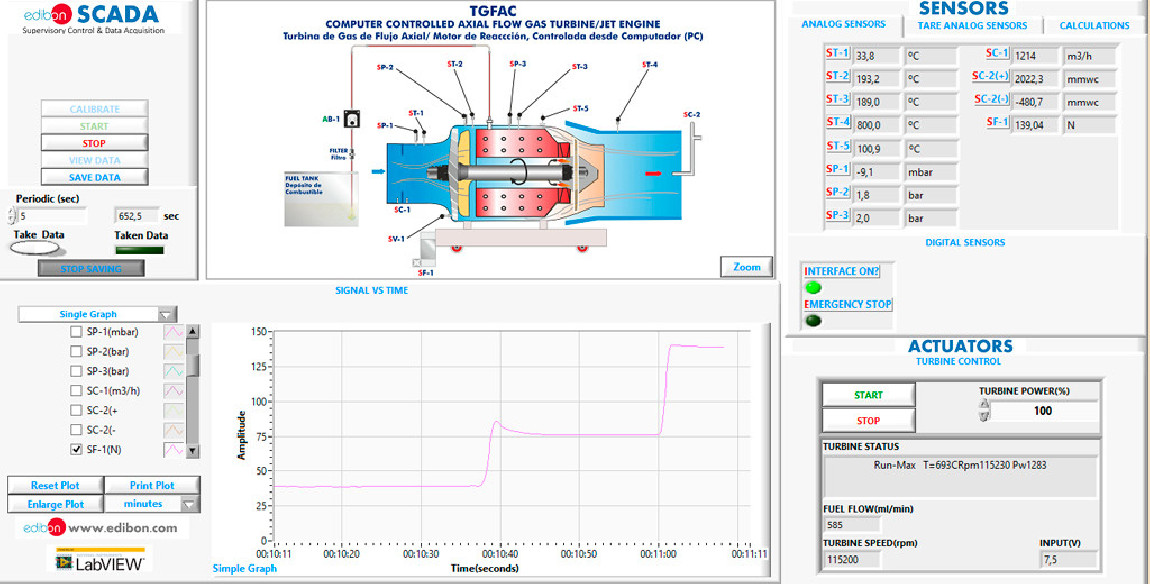 The "TGFAC" unit includes the sensors required to measure all the important parameters of the process: pressure, temperature, air flow and fuel flow, speed and force (movable table with force sensor to measure thrust).