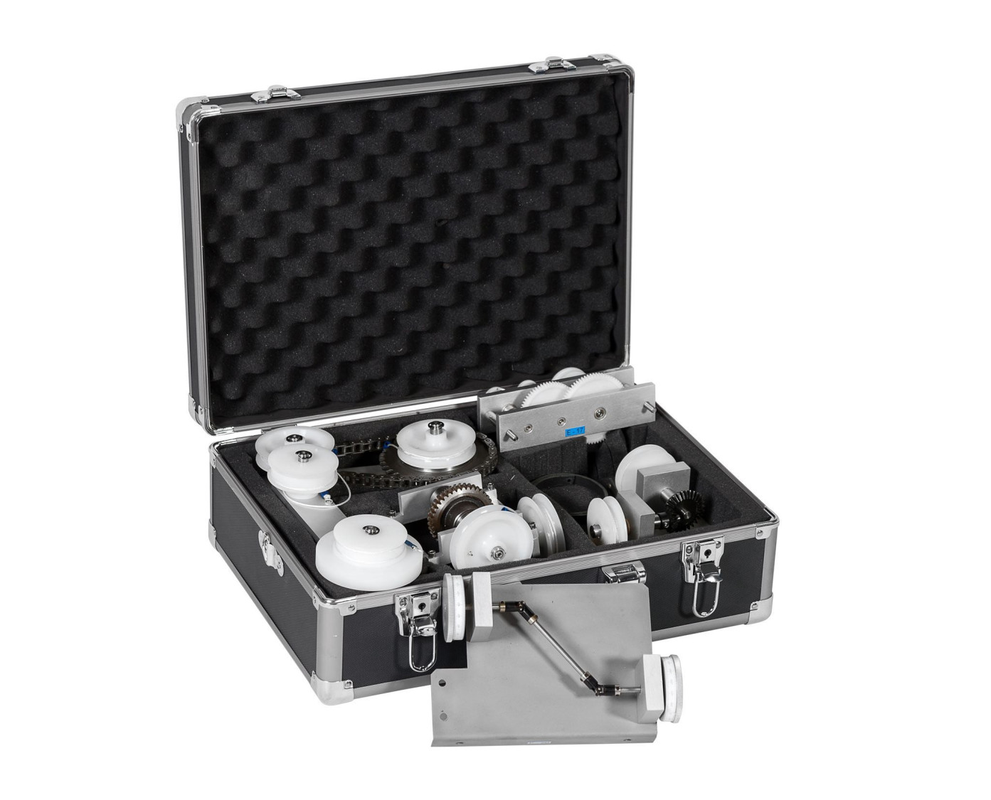 - Belt drive (Belt drive (I) and Belt drive (II)): Verification of the direction of rotation of open and crossed belt drives. Verification of the speed of rotation of the two pulleys is inversely proportional to their diameters. To measure the difference in tension between the two sides of a belt drive and to determine the efficiency of drive transmission.