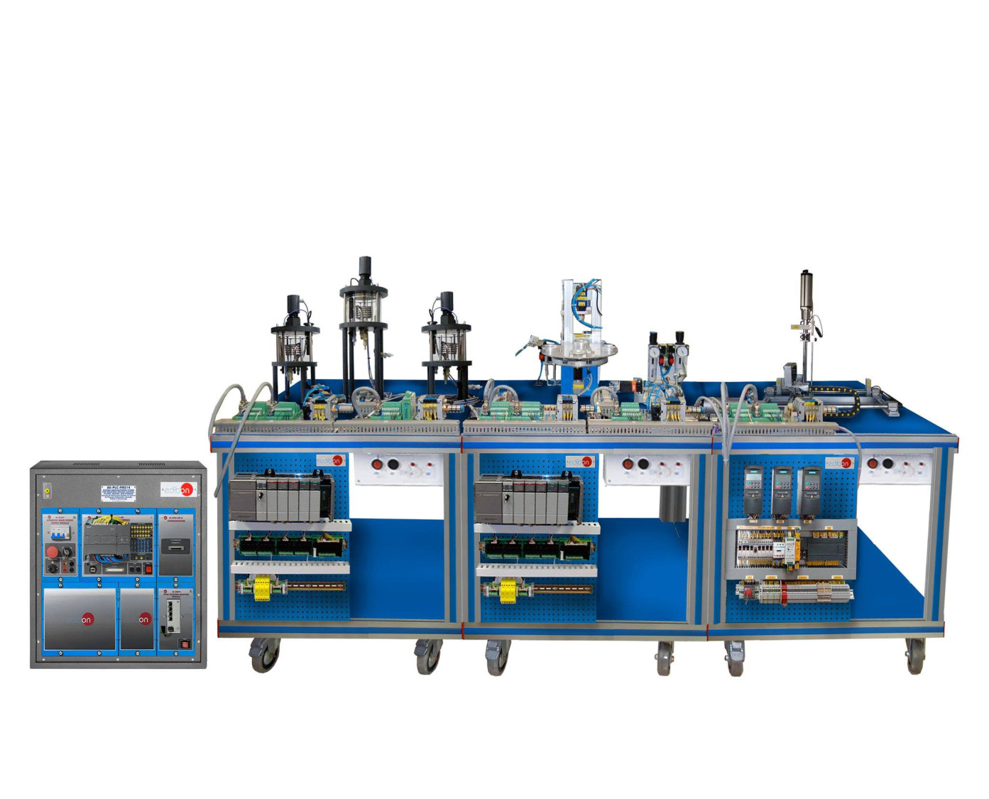 It consists of three interconnected stations that perform specific tasks of temperature, level, flow, and pressure control, in addition to carrying out a filling, bottling, and sealing process. Each of these workstations requires its own PLC from the selected brand (PANASONIC, SIEMENS, ALLEN BRADLEY, MITSUBISHI and/or OMRON), allowing users to explore how advanced control and production concepts are applied in an automated manufacturing line. The workflow is coordinated by a central PLC system (from the same brand chosen for the stations) and an Ethernet network, making the "AE-PLC-FMS14" a comprehensive learning resource for those interested in automation engineering and flexible manufacturing.