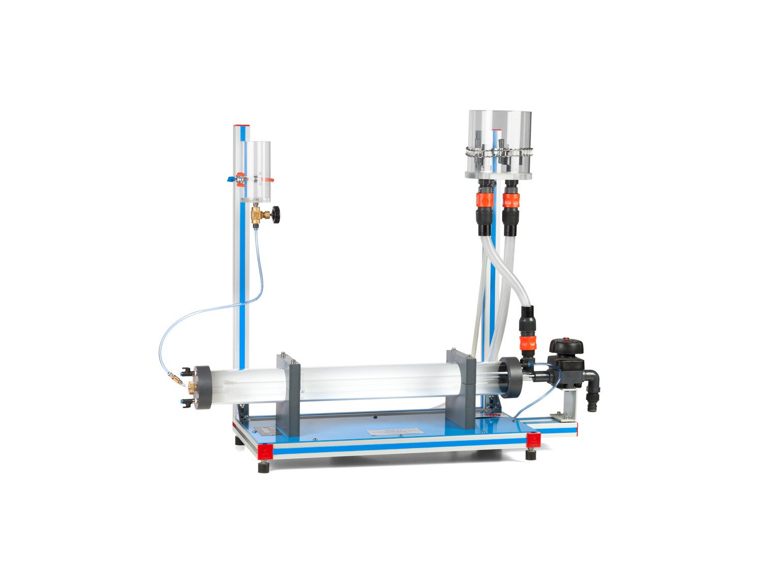 The FME31 unit makes it possible to study the characteristics of the flow of a liquid inside a pipe and the behaviour of such flow. Besides, it is possible to determine the range of the laminar and turbulent flows using the Reynolds number. Thus, difference between laminar, turbulent and transition flows can be demonstrated and the Reynolds number can be calculated for each regime.