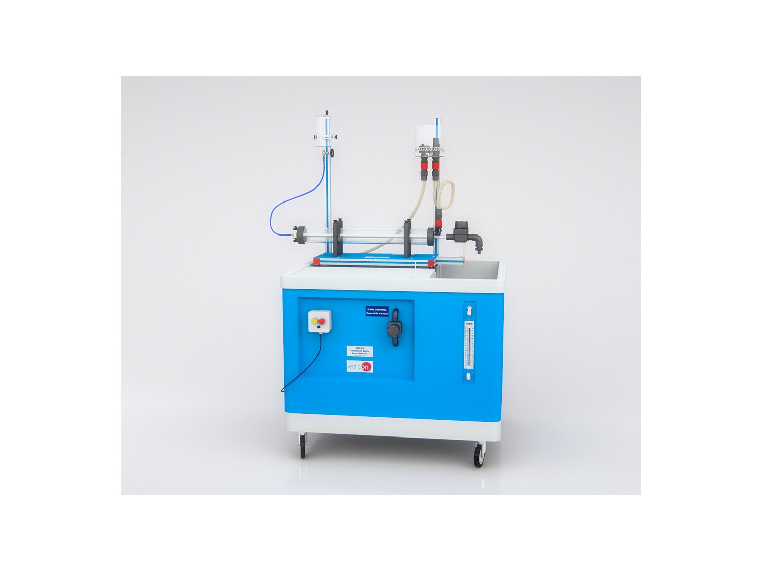 This unit consists on a transparent and horizontal pipe section, which makes it possible to visualize the fluid, a water supply tank, which guarantees the flow homogeneity, and a needle connected to a tank through a hose, from where the dye is supplied. Water flow in the test section can be regulated by means of a valve.