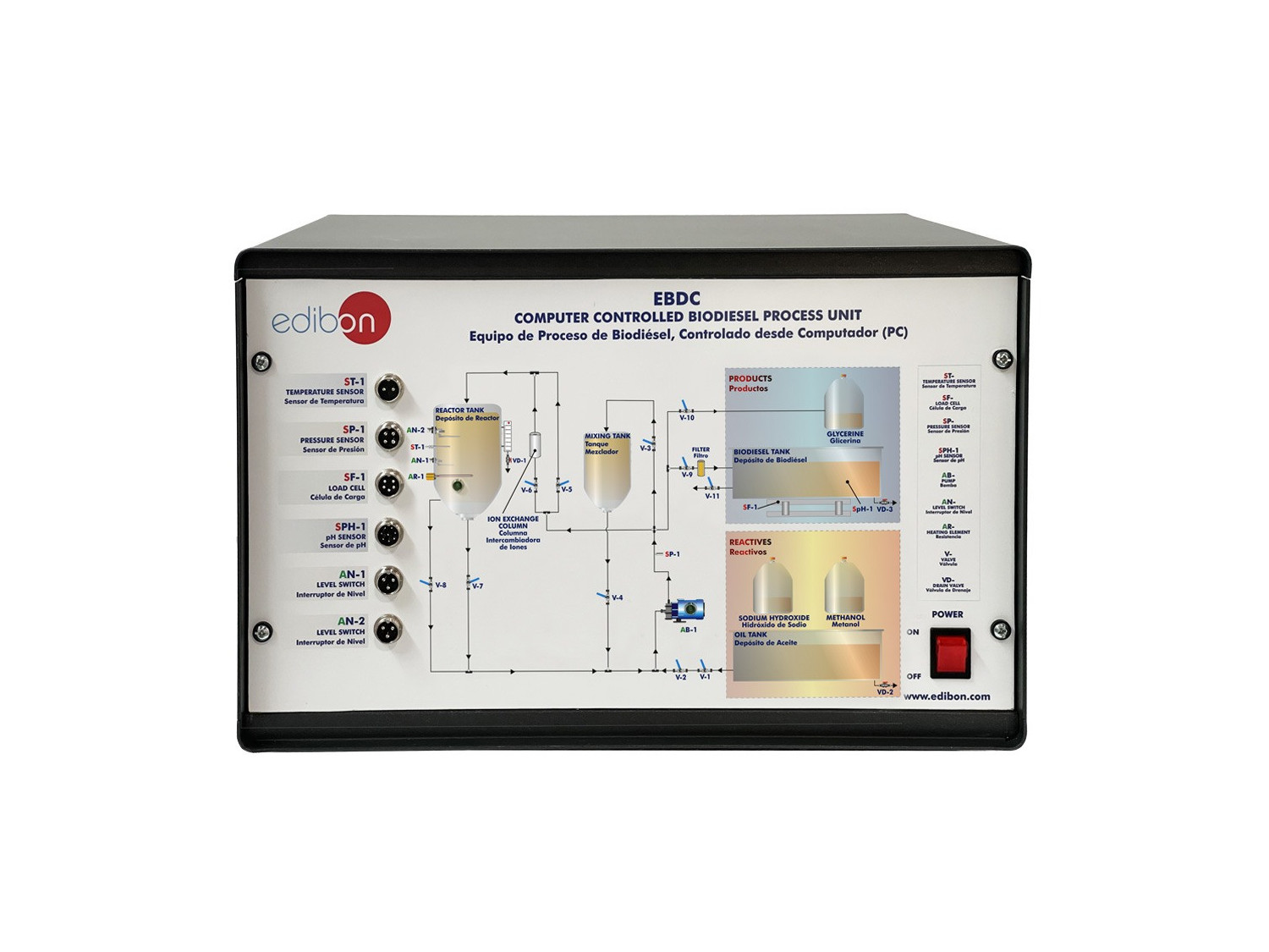The Computer Controlled Biodiesel Process Unit, "EBDC", allows the production of biodiesel from vegetable oil by studying the main parameters that influence the performance of the process and the final quality of the product. Among these parameters are the operating temperature, the amount of catalyst used and the operating time.