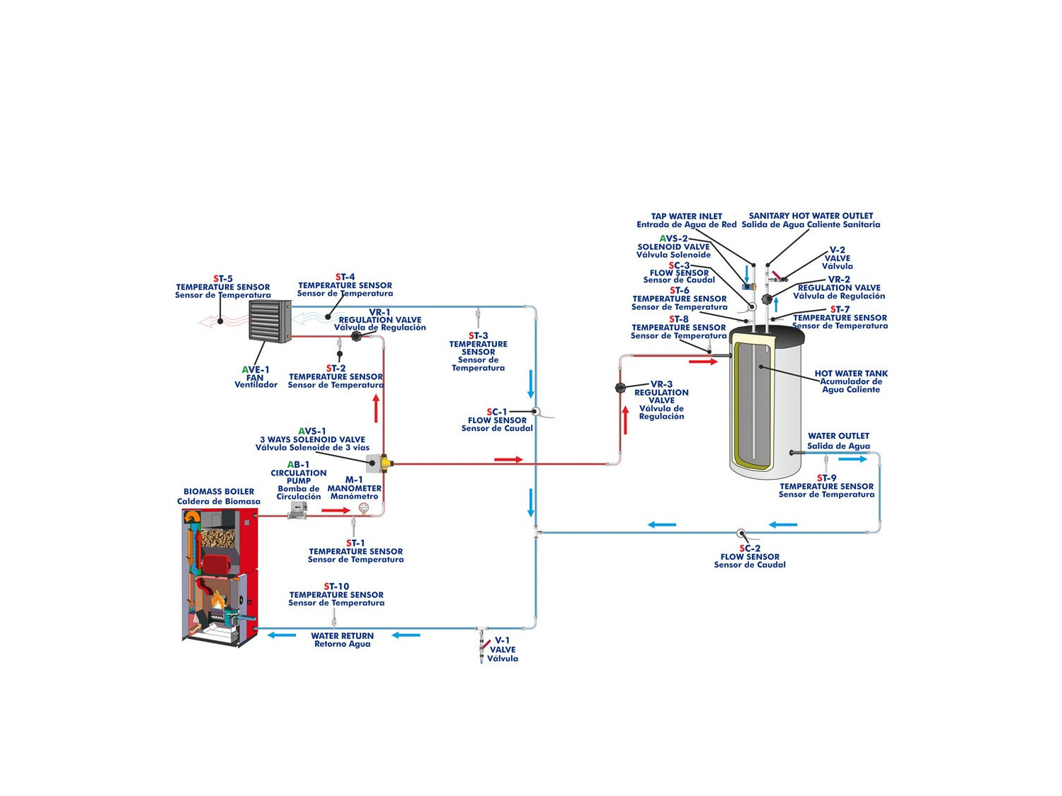 The unit also includes a computer controlled three-ways solenoid valve that distributes the water heated by the biomass boiler towards two primary circuits: one towards the double jacket of the storage tank to obtain domestic hot water and the other towards the unit heater to generate heating.