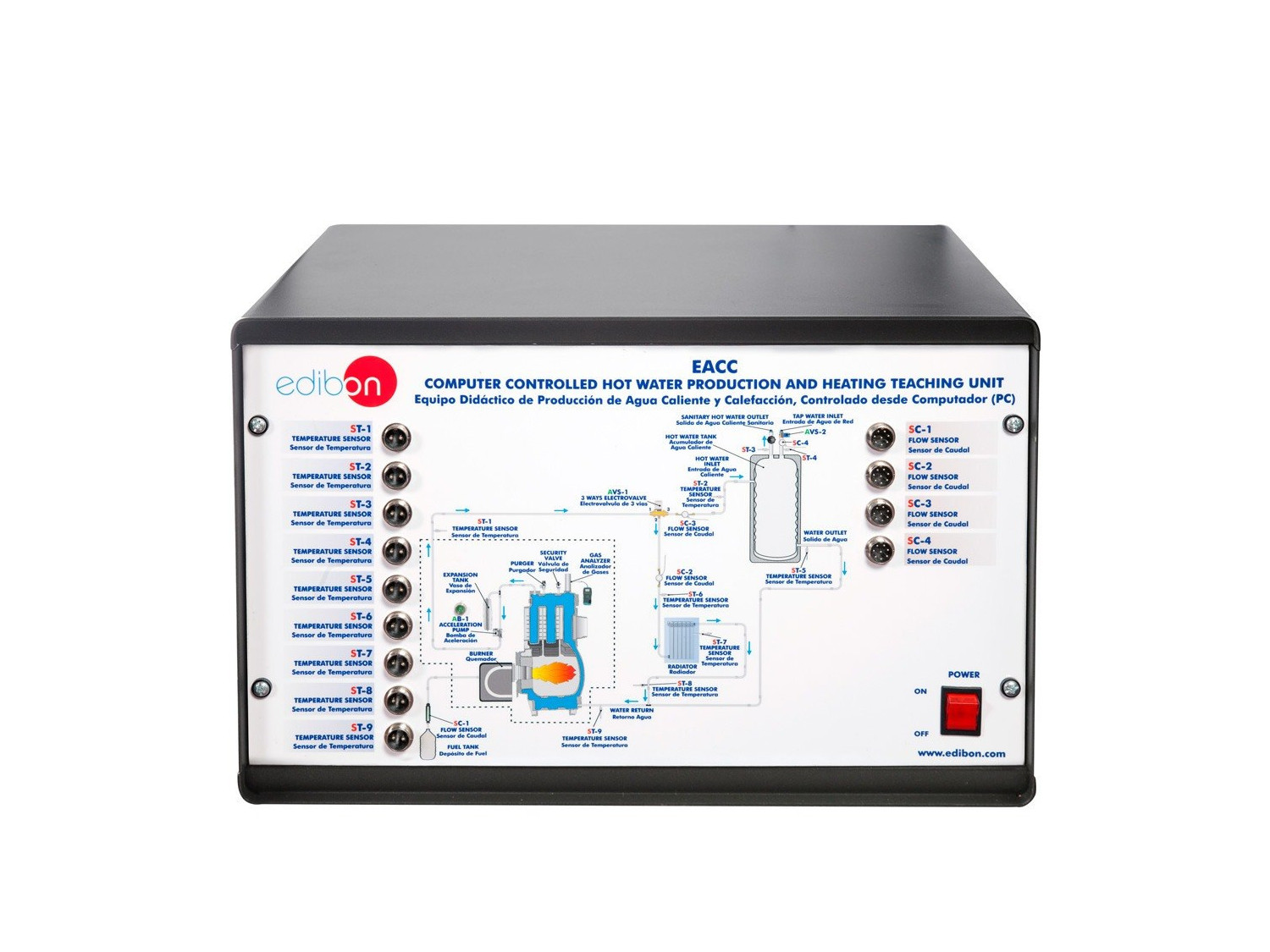 The computer controlled hot water and heating generation unit, "EACC", developed by EDIBON, is a didactic unit that the students can use to learn about heating installations and the production of domestic hot water, both for houses and colective blocks with a boiler in each dwelling.