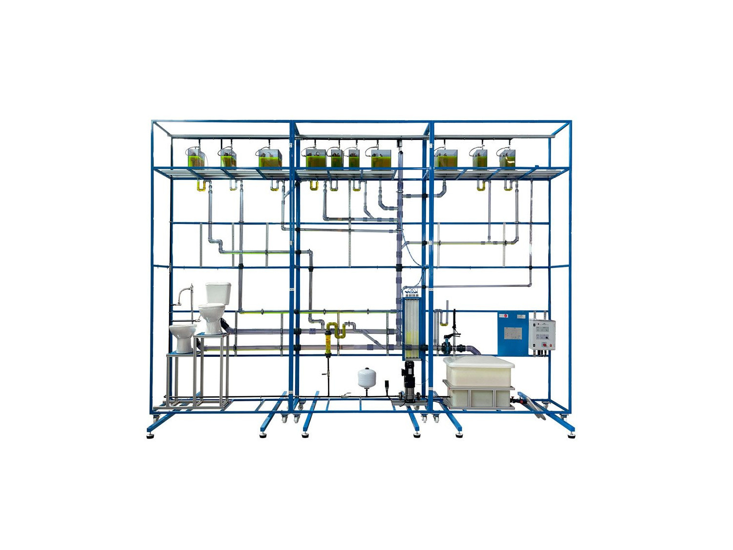 A complete sewage system can be observed with the "TSID" unit. The collection of wastewater from a series of sanitary ware and appliances is simulated, since all water supplies must include a downpipe. The unit has ten toilet tanks at the top, a toilet with tank, a toilet with pressure flush, ventilation pipes and bypass pipes. All of them are controlled by the user with solenoid valves. The tank valves are activated by remote control.