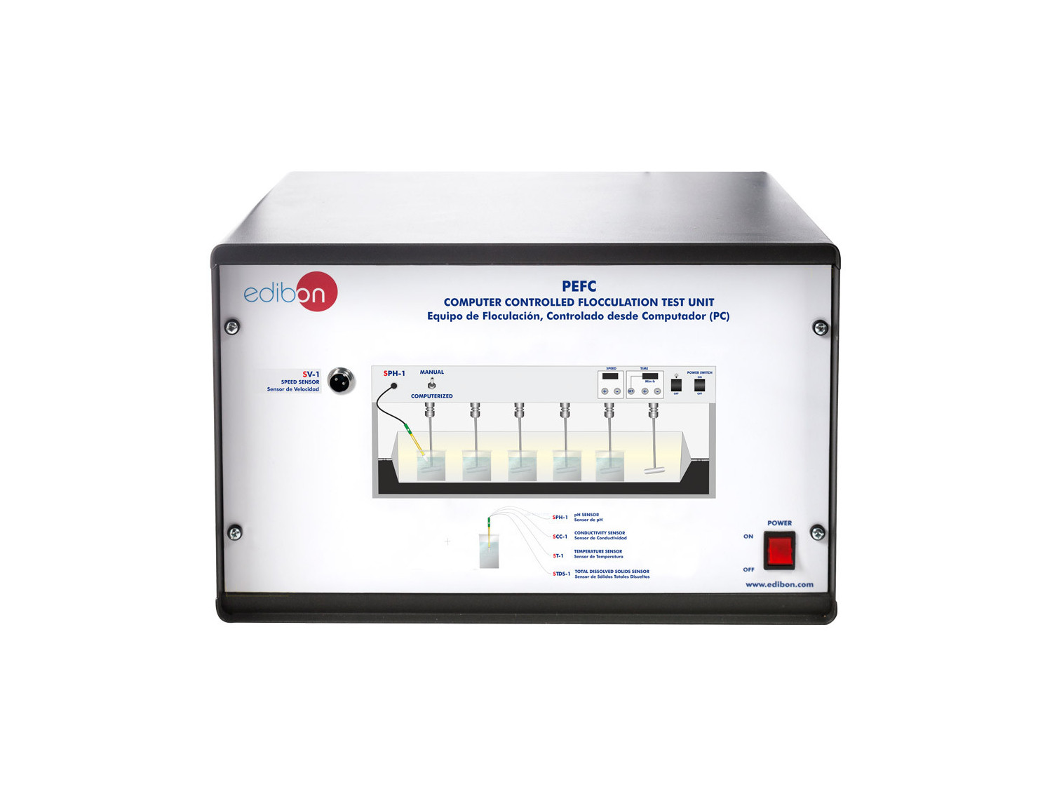 The Computer Controlled Flocculation Test Unit, "PEFC", designed by EDIBON, shows the removal of dissolved substances by coagulation and flocculation.