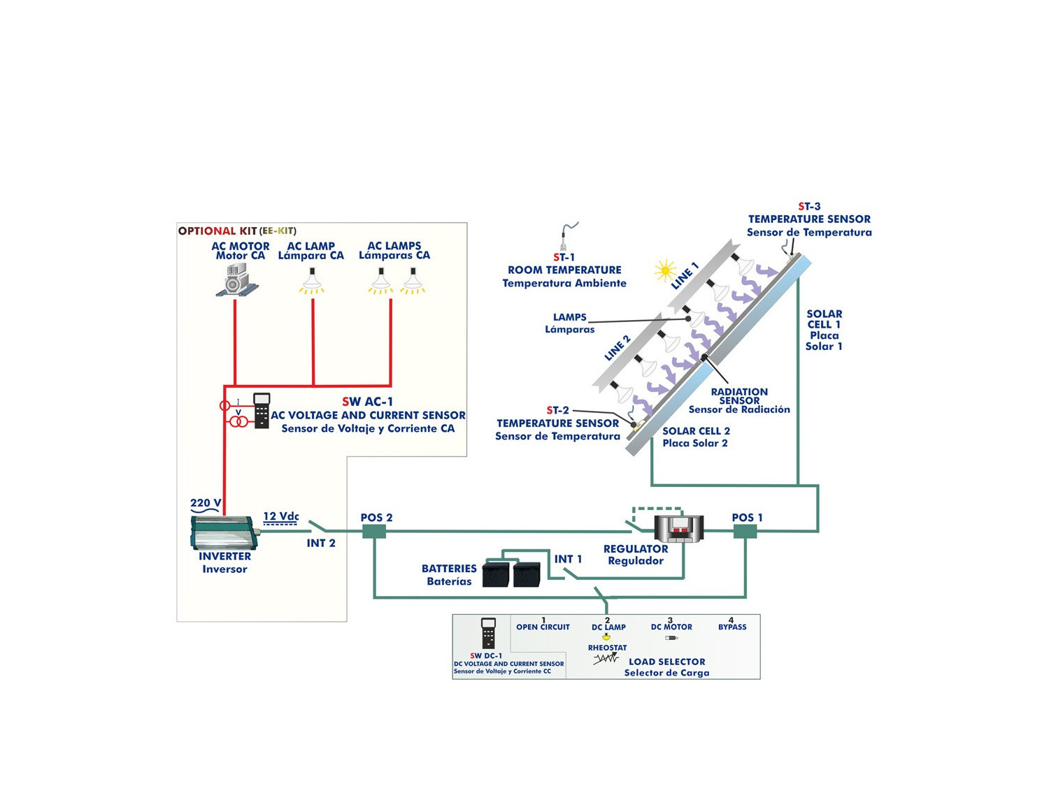 - Sensors (temperature, light radiation, DC current and DC voltage).