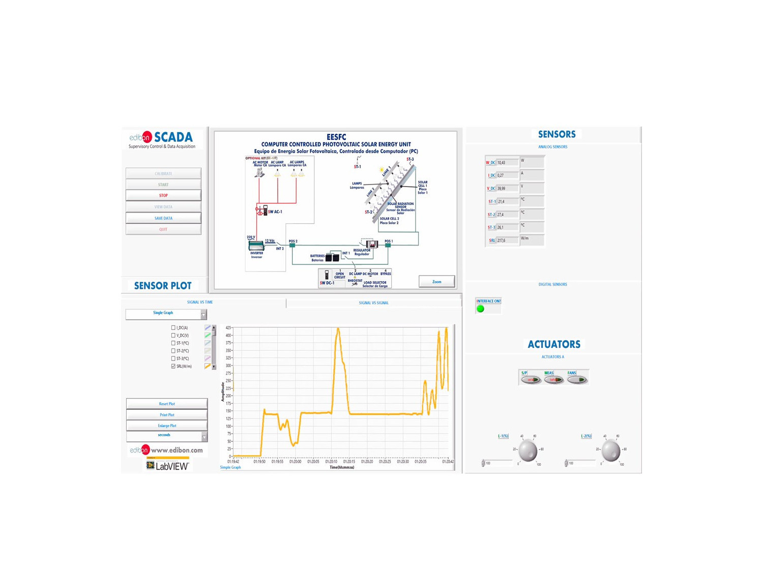 The Computer Controlled Photovoltaic Solar Energy Unit, "EESFC", includes equipment that uses the photo-conversion law for the direct conversion of solar radiation into electricity. The absorbed energy is provided by simulated solar radiation, which in our case is supplied by a panel with powerful light sources (solar lamps).