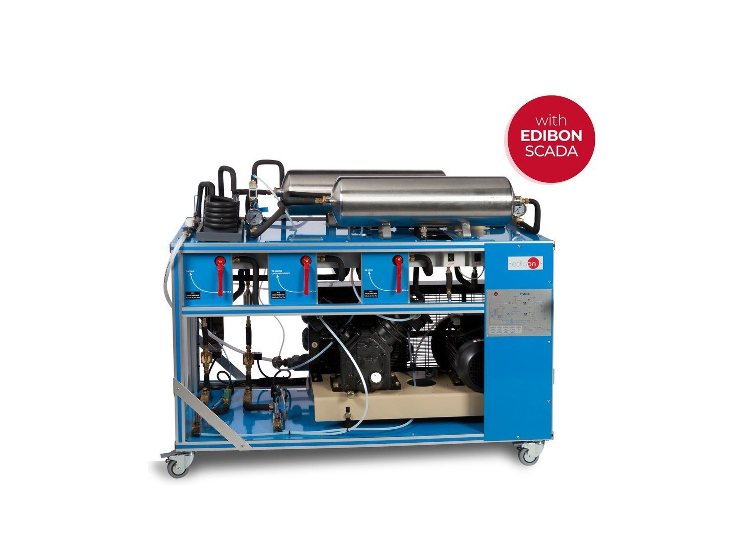 The Computer Controlled Two-Stage Compressor Test Unit, "HCDEC", is a unit that allows for studying single-stage compression and two-stage compression (compression work, efficiency, P-V curves and thermodynamic properties among others). Besides, it allows for studying compression with and without refrigeration in the intermediate stage.