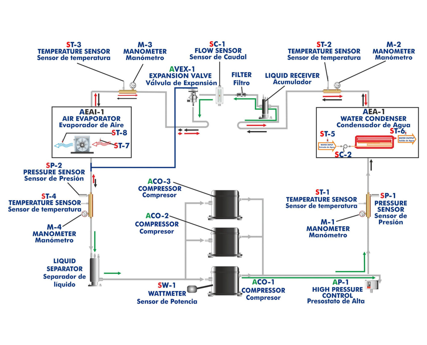 The objective of the Computer Controlled Refrigeration Control Unit with several Compressors, "THALAC/1", designed by EDIBON, is to introduce the student into the complex world of heat pumps systems, as well as studying and determining the characteristic operation parameters of the unit in function of the environmental requirements (humidity, heat, temperature and cooling, etc.).