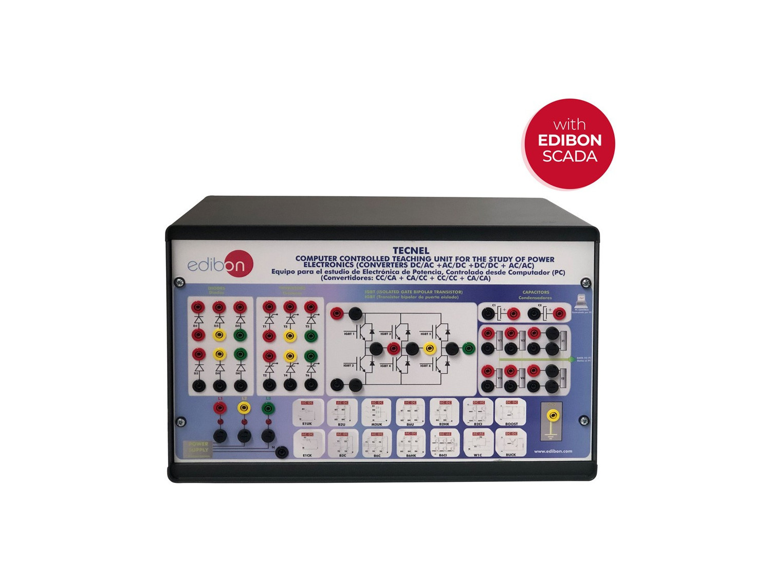 The Computer Controlled Teaching Unit for the Study of Power Electronics (with IGBTS). (Converters: AC/AC+AC/DC+DC/DC+AC/ AC), "TECNEL", designed by EDIBON, is a unit with Computer Control and Data Acquisition System designed to study the basis of Power Electronics. It allows students to study AC/DC, DC/AC, DC/DC, AC/AC converters.