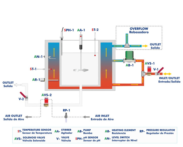 The Computer Controlled Cheese Vat, "AEQC", can be operated in manual or computerized way (performing the control and acquisition of data through the computer). The pump and the agitator speed, as well as the heating water temperature, are controlled. In addition, the pH and the temperature of the vat content and the agitator speed are monitored.
