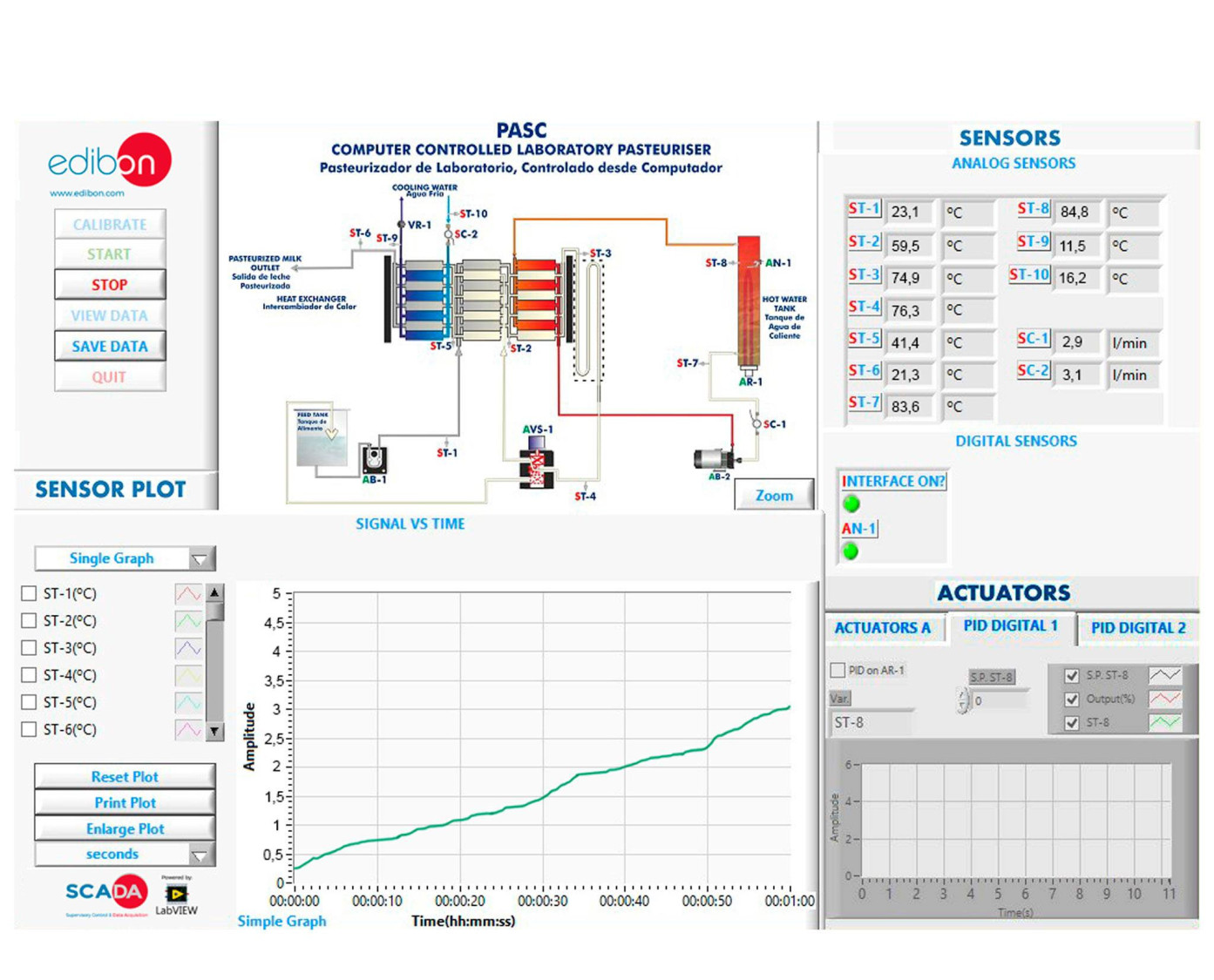 The Computer Controlled Laboratory Pasteurizer, "PASC", is a small scale continuous flow pasteurizer designed by EDIBON. It performs HTST pasteurization (High Temperature Short Time), which simulates the working conditions of a real plant. Nevertheless, small amounts of product can be pasteurized in a short period, resulting in an economical unit whose operation is easy to understand for students.