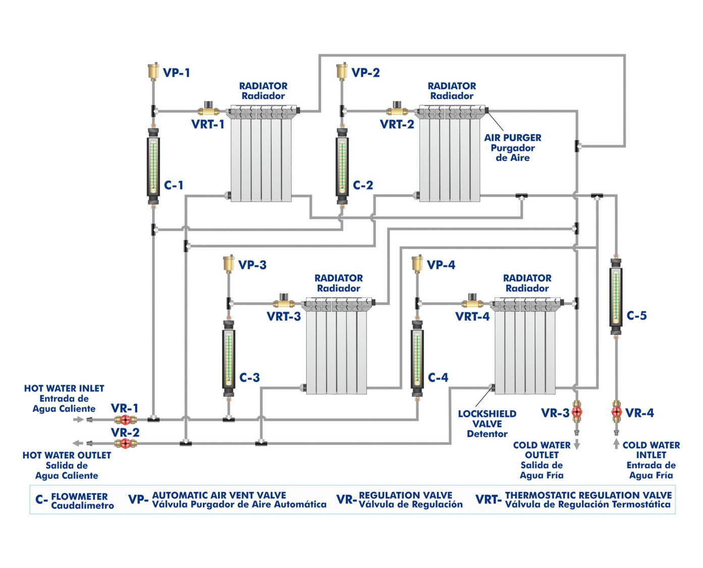 The unit simulates a heating system. It consists of four radiators with a thermostatic valve each to control the temperature and close the flow of water when a specific temperature is reached, a bleed valve to purge air from the pipes and a lockshield valve.
