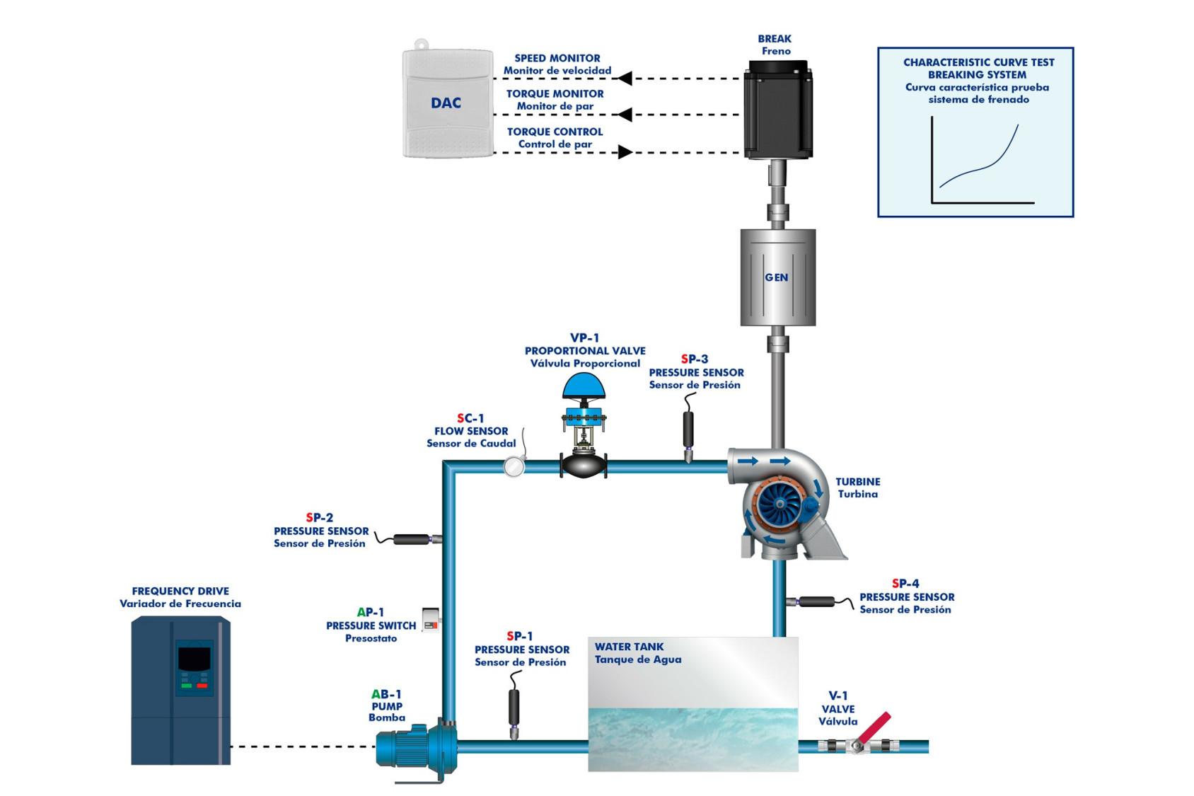 The hydraulic circuit, made of stainless steel and high-strength PVC, allows pressures of up to 3 bar and flow rates up to 8 L/s, ensuring a stable and controllable flow that enables precise studies of turbine efficiency, regulation, and dynamic behavior.