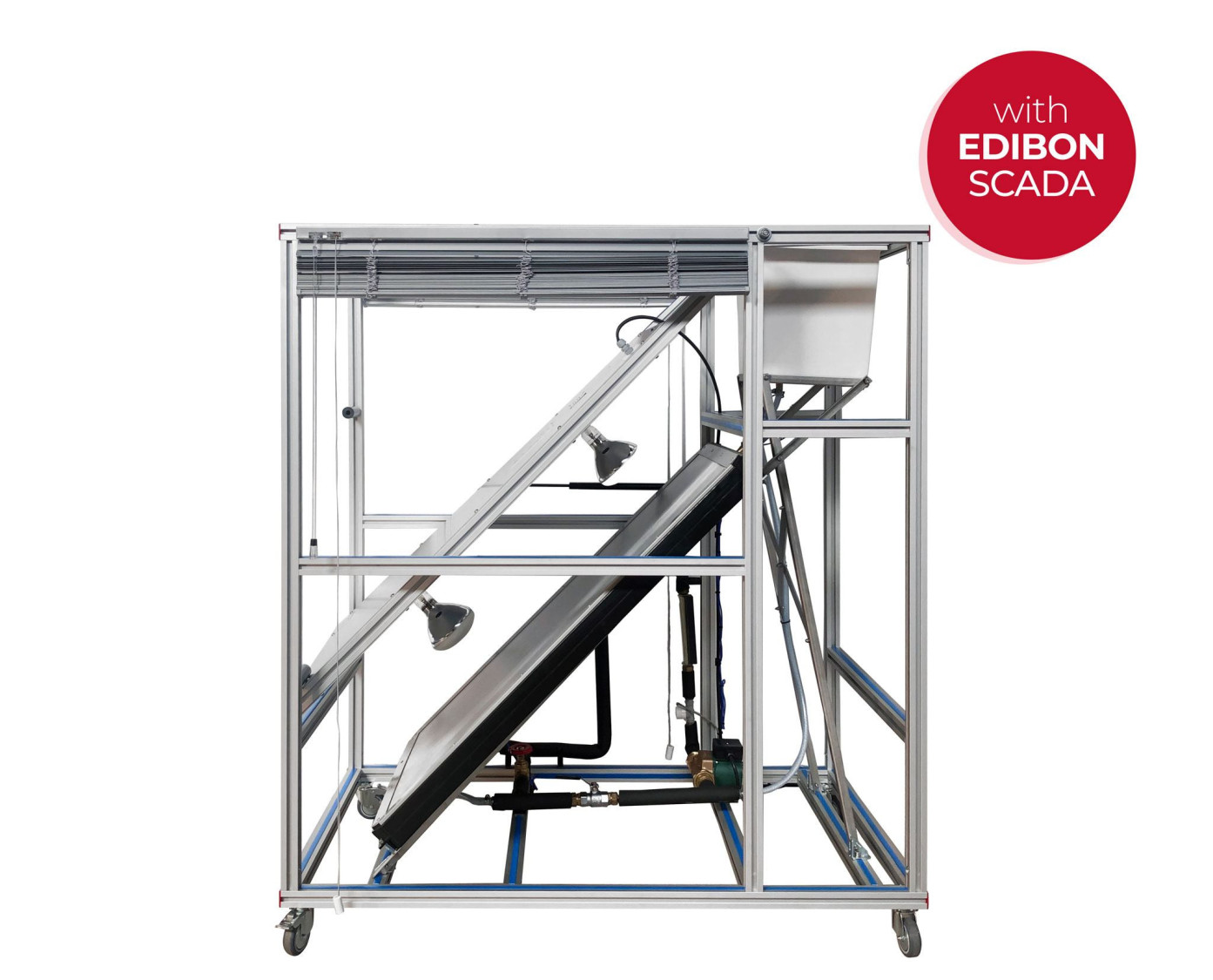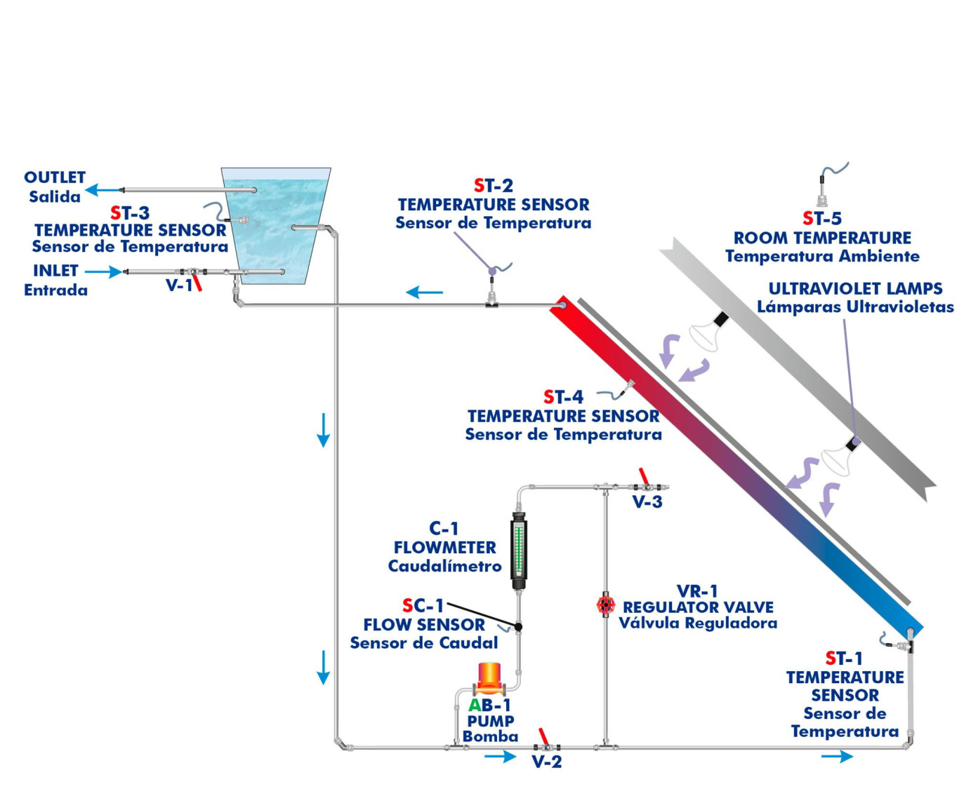 This unit is a system that transforms solar energy into usable thermal energy. It uses the thermosiphon system to heat water or the traditional pumping system. In both cases, the absorbed thermal energy is given by the simulated solar radiation, in our case, it is done using a panel with powerful luminous sources.