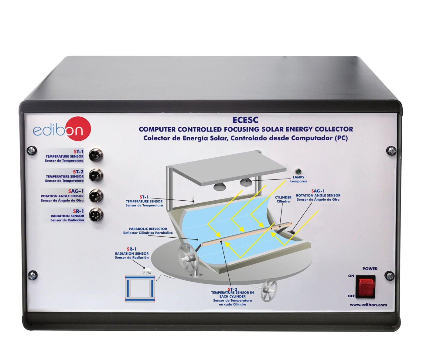 El Colector de Energía Solar, Controlado desde Computador (PC), "ECESC", muestra los principios de un concentrador solar de tipo cilíndrico-parabólico como método de captura de energía solar.