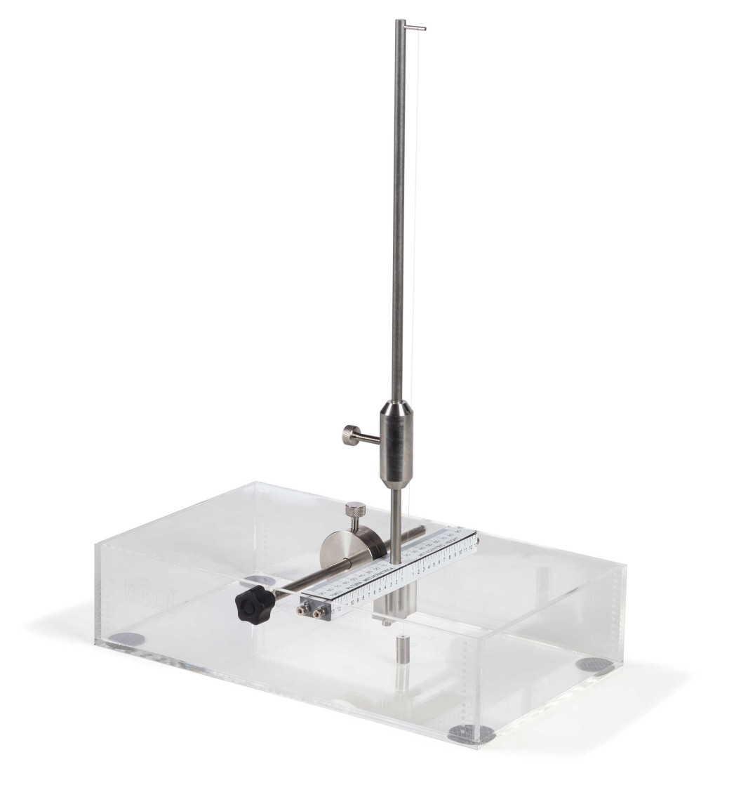 El equipo consiste en una base prismática flotante de metacrilato, en la que se apoya un mástil vertical al que se ha añadido una masa móvil ajustable para variar la posición del centro de gravedad.