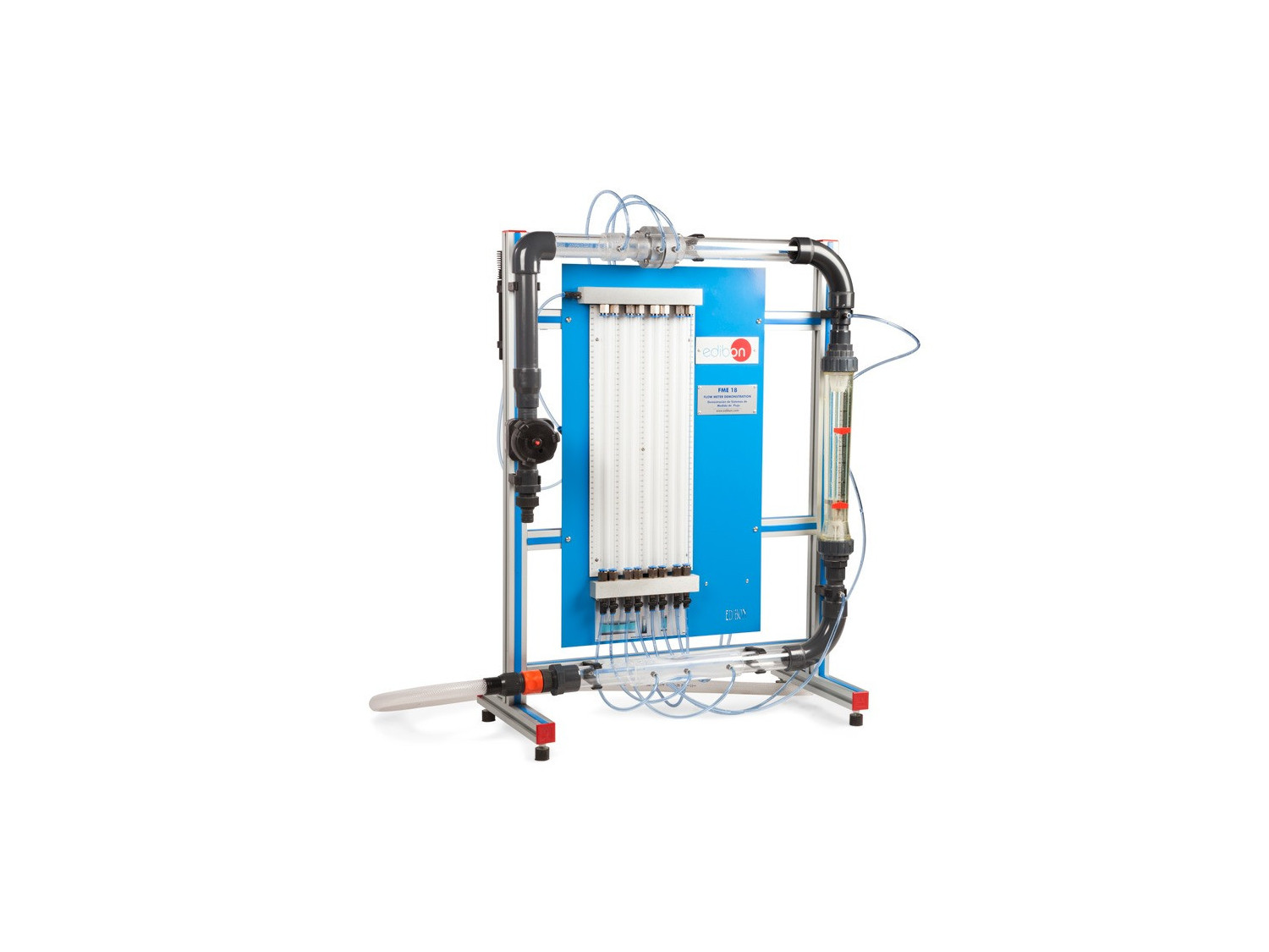 El equipo de Demostración de Sistemas de Medidas de Flujo, "FME18", diseñado por EDIBON, consiste en un medidor Venturi, un medidor de área variable y una placa de orificio, instalados en una configuración en serie para permitir una comparación directa.