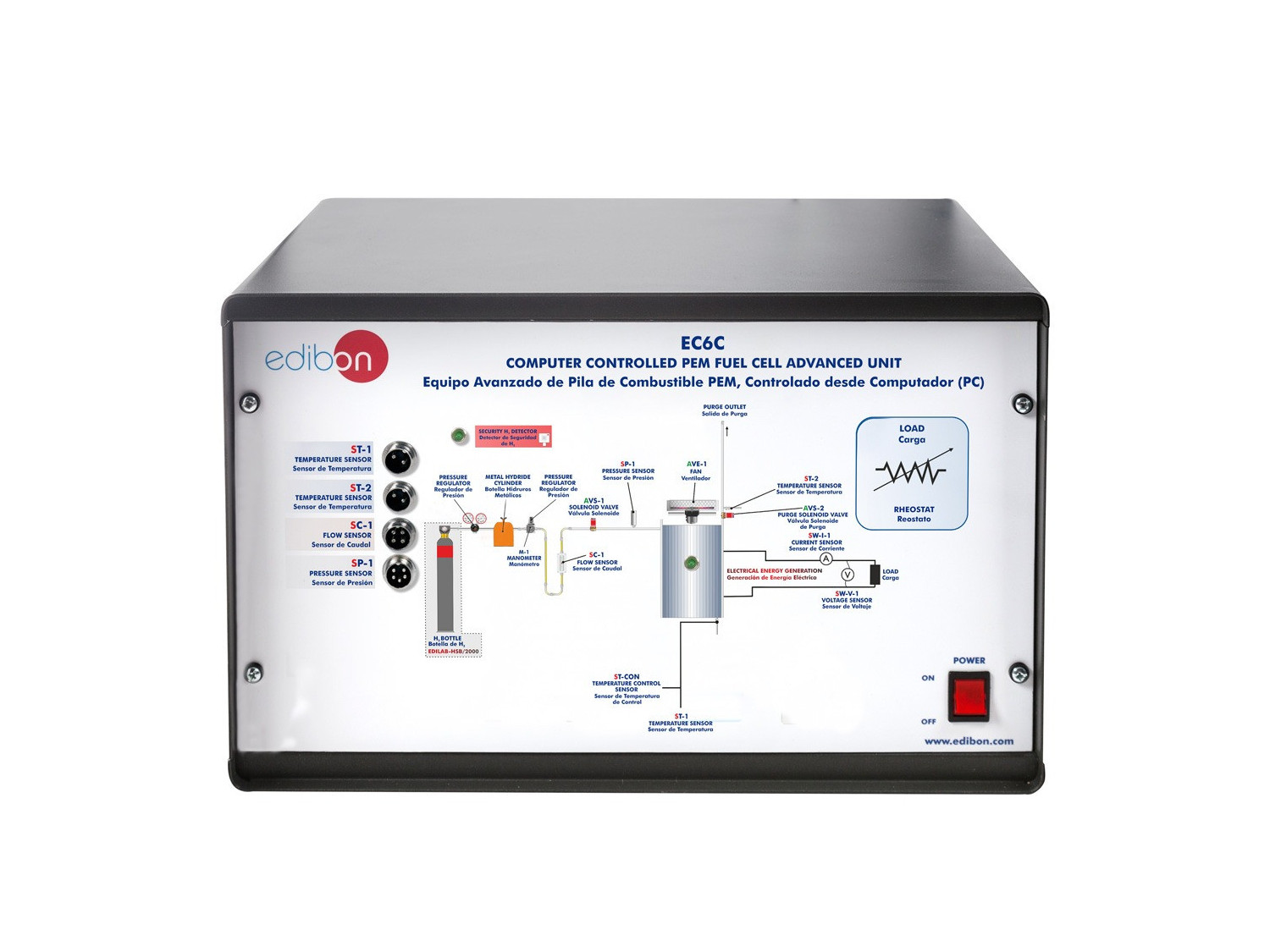 El Equipo Avanzado de Pila de Combustible PEM, Controlado desde Computador (PC), "EC6C", ha sido diseñado por EDIBON para permitir a los estudiantes la comprensión de la tecnología de las pilas de combustible, particularmente el de una pila de combustible de membrana de intercambio protónico (PEM). También permite calcular diversos parámetros fundamentales de la pila de combustible tipo PEM, como la densidad de potencia, curvas de polarización, eficiencia, etc. y la variación de algunos de estos parámetros en función del consumo de reactivos y de la potencia desarrollada.