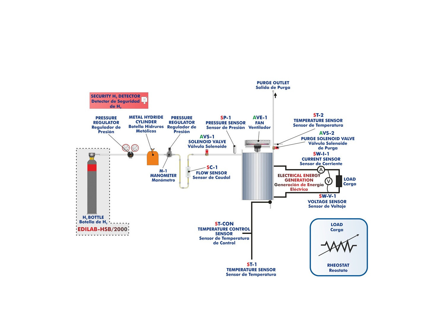 Se incluyen dos válvulas solenoides. Una de ellas está situada antes del stack, la cual controla la entrada del hidrógeno y que cuando el equipo está apagado dicha válvula está cerrada para evitar posibles fugas de hidrógeno. La otra válvula está situada a la salida del stack y purga hacia el exterior el agua y el hidrógeno sobrante para un correcto funcionamiento.