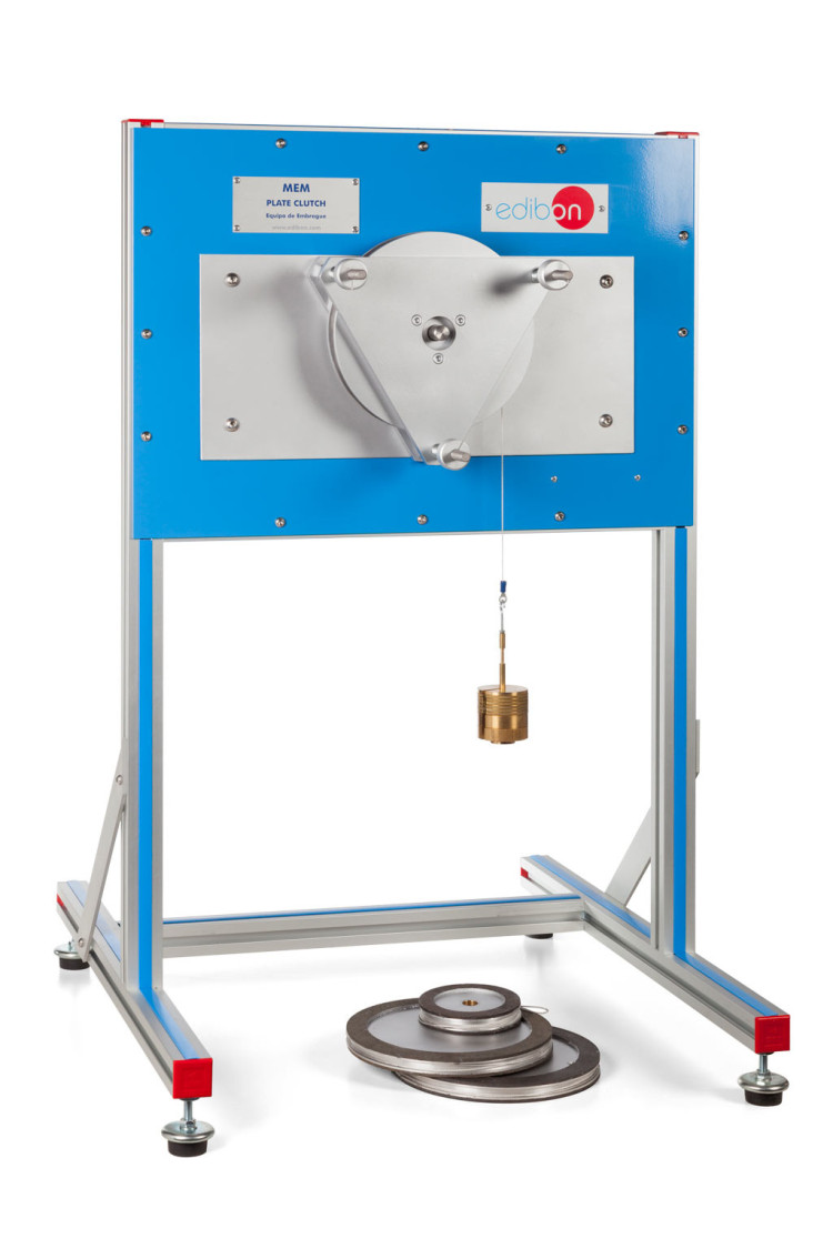 El Equipo de Embrague, "MEM", ha sido diseñado por EDIBON, para demostrar la influencia de la superficie de fricción y la presión aplicada de los muelles sobre el par transmitido para un embrague de fricción. Para ello se emplearán varios discos de embrague con diferentes diámetros y coeficientes de rozamiento y unos muelles, con tuercas de apriete con marcas, para aumentar la presión en el sistema.