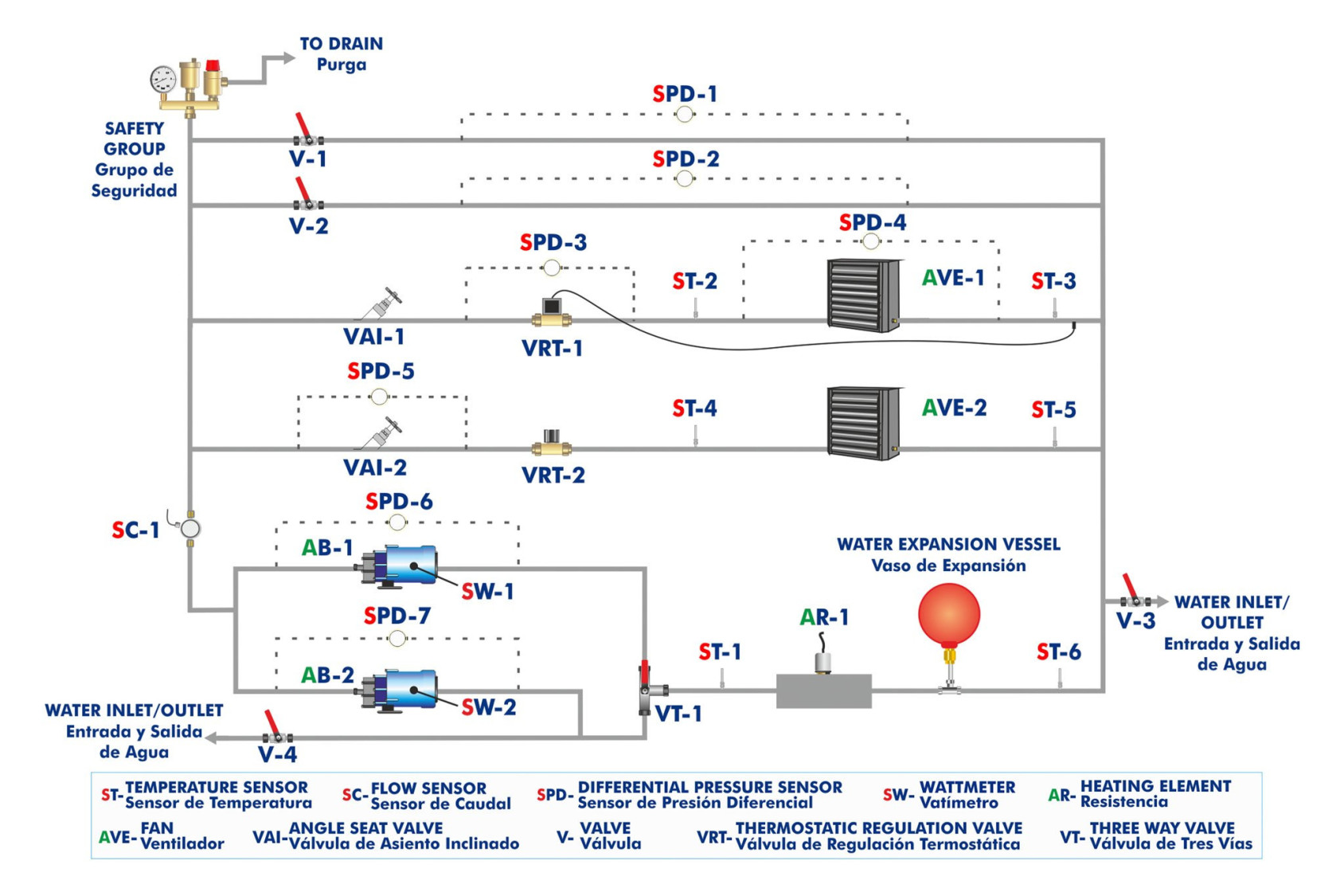 Además de estudiar la pérdida de carga producida en los diferentes elementos del sistema de calefacción, el equipo incluye sensor de caudal de agua, dos sensores de potencia de las dos bombas circulatorias y seis sensores de temperatura repartidos en puntos clave del sistema, que permiten los cálculos de flujos energéticos y análisis de eficiencia.