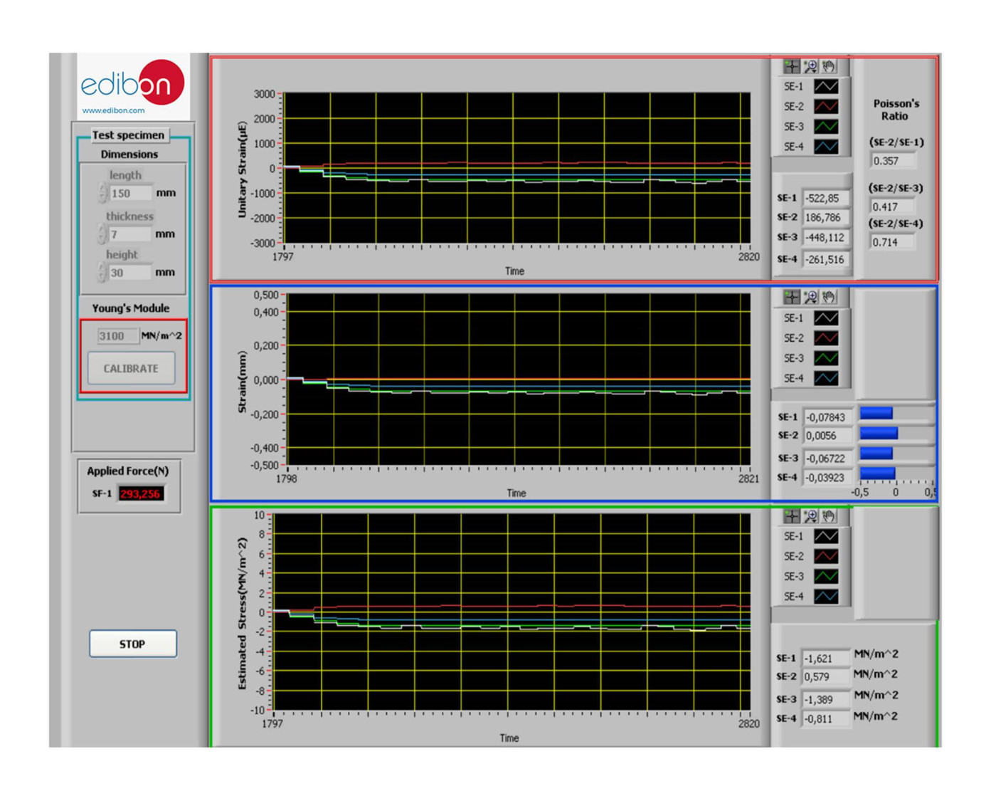 El equipo incluye muestras con galgas extensiométricas y los accesorios (electrónicos, mecánicos y de software) necesarios para adquirir todos los valores en el ordenador en tiempo real y permite comparar las ventajas de un método y otro.
