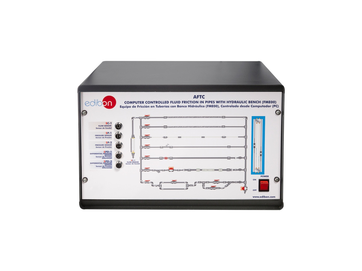 El Equipo de Fricción en Tuberías, con Banco Hidráulico (FME00), Controlado desde Computador (PC), "AFTC", está diseñado para determinar los coeficientes de fricción en tuberías de diferentes diámetros y rugosidades, para estudiar las pérdidas de carga y desarrollos de presión en diferentes tipos de válvulas y acoplamientos y para comparar diferentes métodos de medir el caudal.