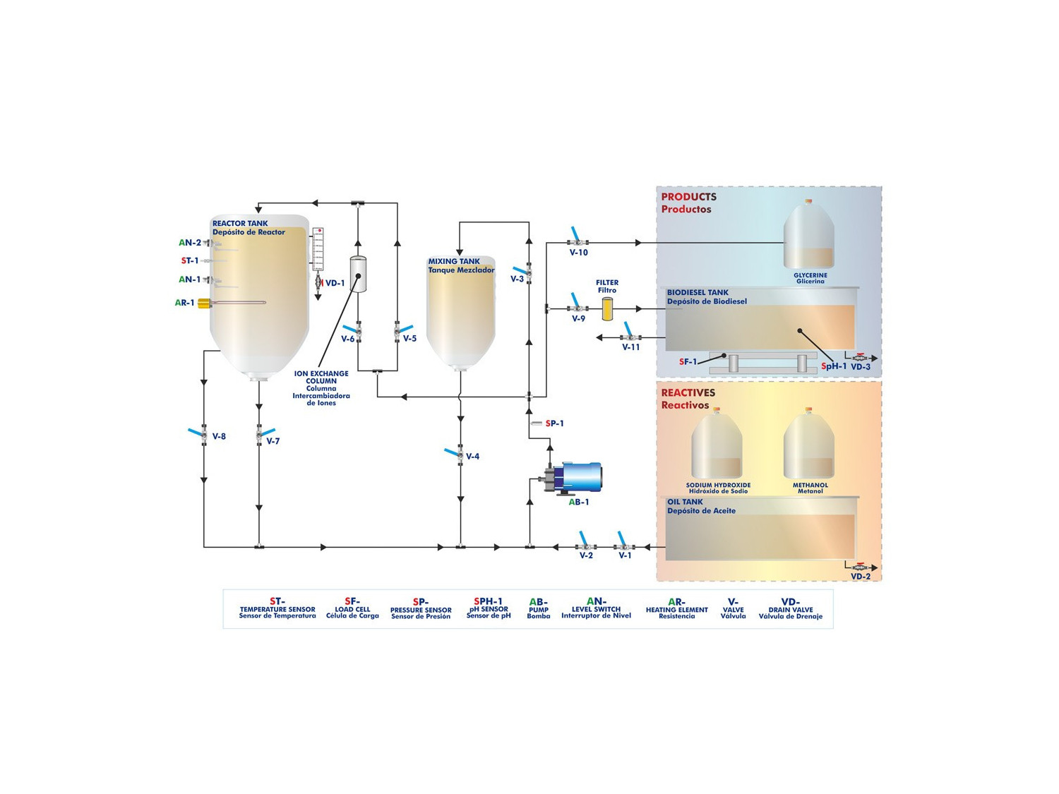 - Etapa I: Mezclado y reacción bajo agitación. Esta primera etapa comienza con la adición de aceite vegetal al tanque principal (reactor), y de la preparación del catalizador en un reactor secundario de menor tamaño. A continuación, se combinan reactivo y catalizador sometiendo a la mezcla a una agitación intensa y a un calentamiento homogéneo, esto se consigue recirculando el medio a través de una bomba centrífuga y aportando calor mediante una resistencia eléctrica, ambos actuadores son controlados desde computador (PC). Esta etapa se realiza en un reactor de acero inoxidable con sensor de temperatura e interruptores de nivel que permiten una operación controlada y segura.