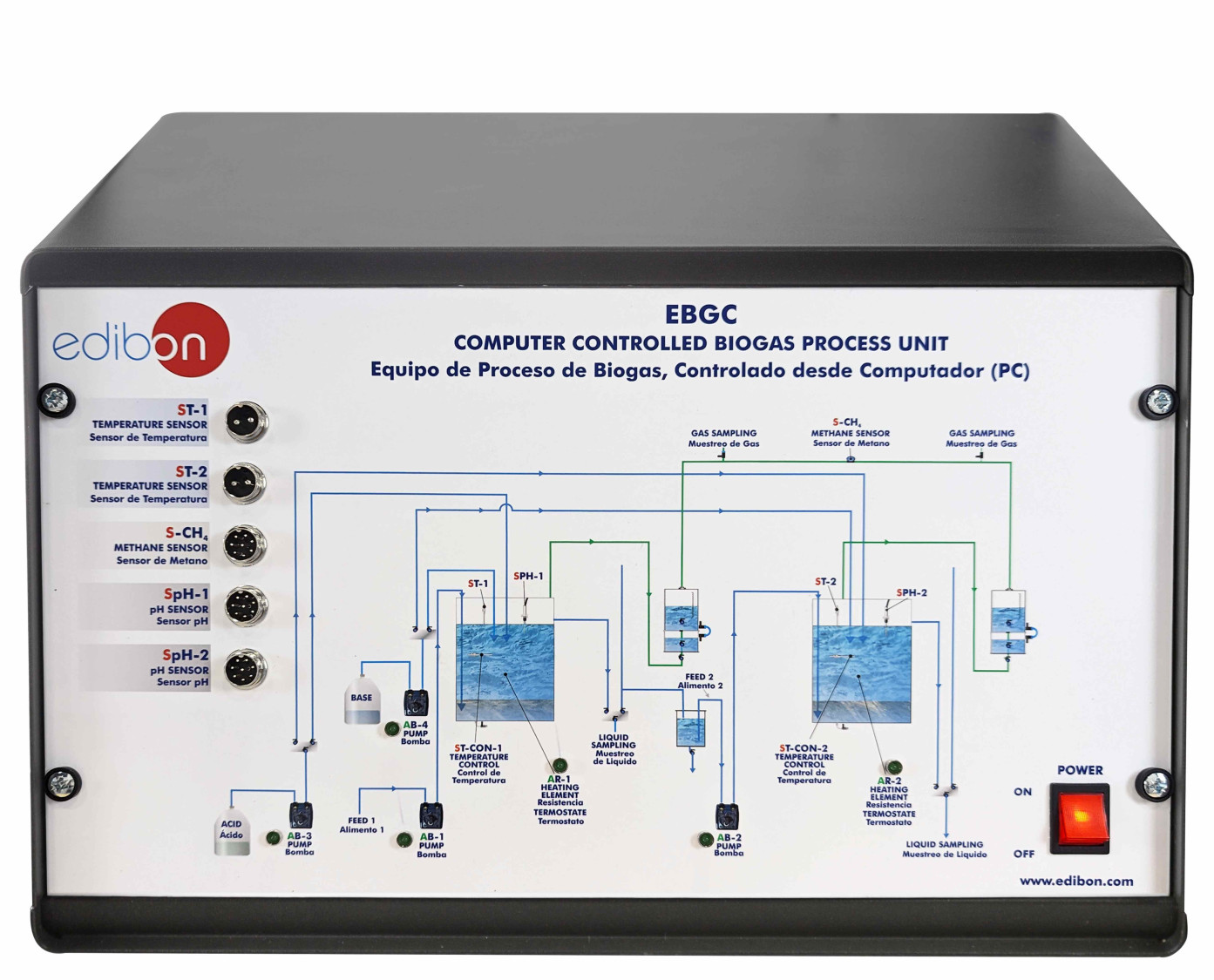 El Equipo de Proceso de Biogás Controlado desde Computador (PC), "EBGC", diseñado por EDIBON, se suministra con dos digestores anaerobios empaquetados. De esta forma se permite al usuario trabajar o bien en una sola etapa o en dos etapas, separándose las diferentes fases del proceso de la digestión (en el primer digestor tendrán lugar los procesos de hidrólisis, acidogénesis y acetogénesis, y en el segundo digestor la metanogénesis).