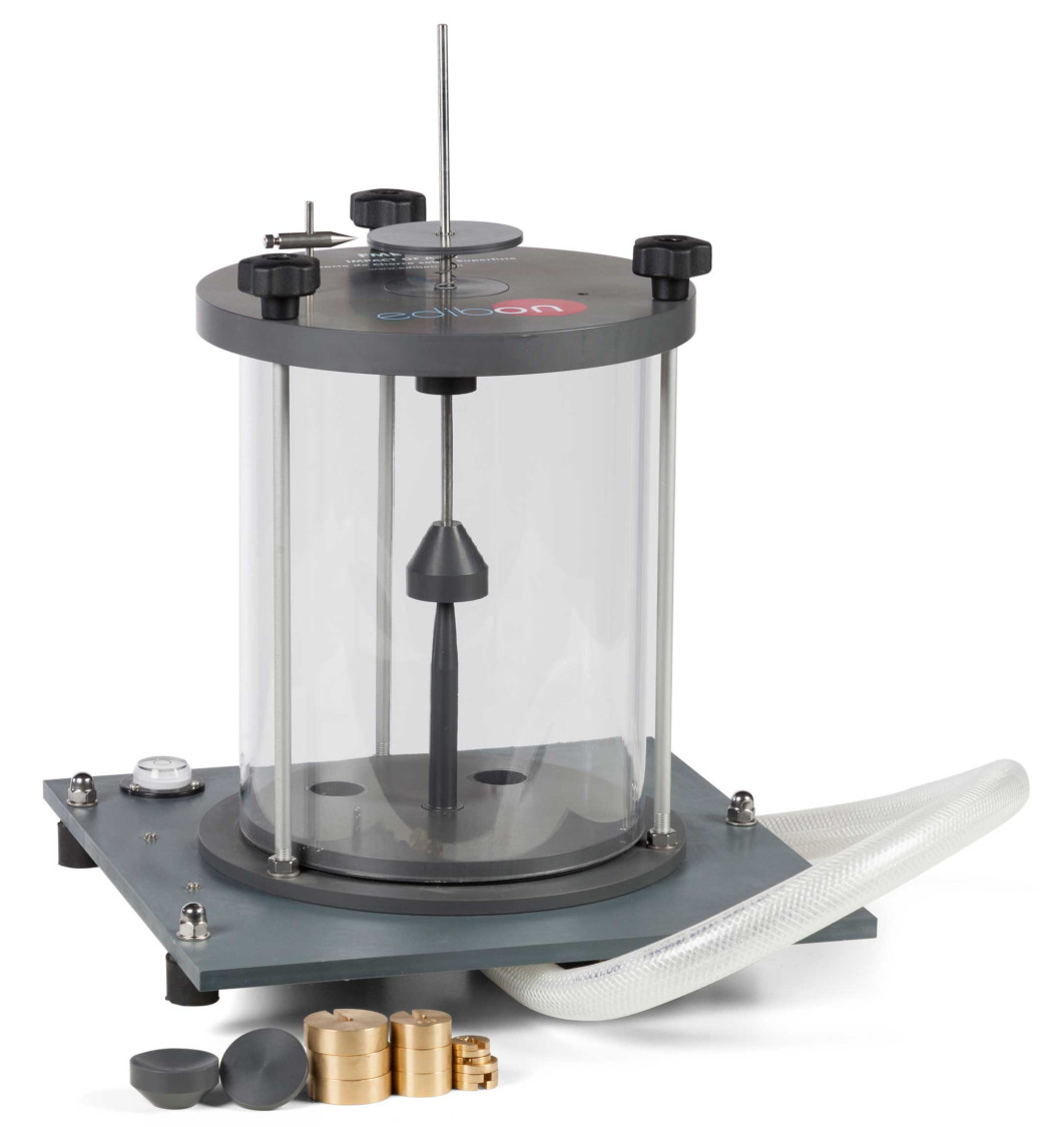 El FME01 está compuesto por un tanque cilíndrico con paredes laterales transparentes, lo que permite visualizar el impacto del chorro sobre la superficie en estudio. En su interior, una boquilla alineada con el eje central dirige el flujo de agua hacia la superficie seleccionada, facilitando la medición de la fuerza ejercida. Para una cuantificación precisa, el equipo incorpora un sistema de masas calibradas, que equilibra la fuerza del agua y permite su medición mediante un indicador de referencia ajustado previamente.