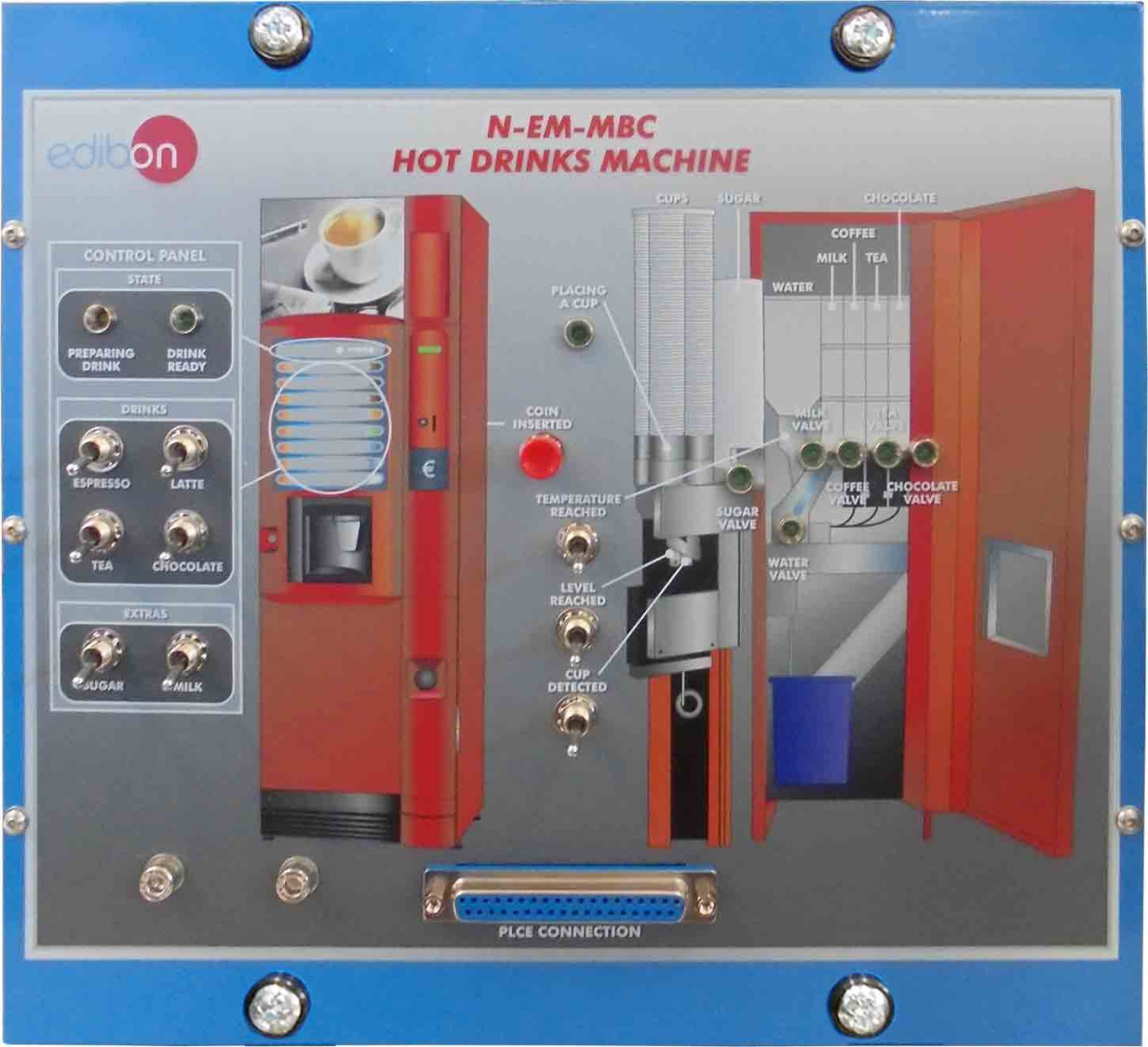 "N-EM-MBC" representa una máquina de bebidas calientes que emula el esquema de acción llevado a cabo por una máquina de bebidas calientes para proporcionar la bebida caliente deseada. Los diferentes interruptores y pulsadores emulan el nivel de las distintas bebidas dentro de la máquina, la elección del tipo de bebida por parte del usuario, etc.