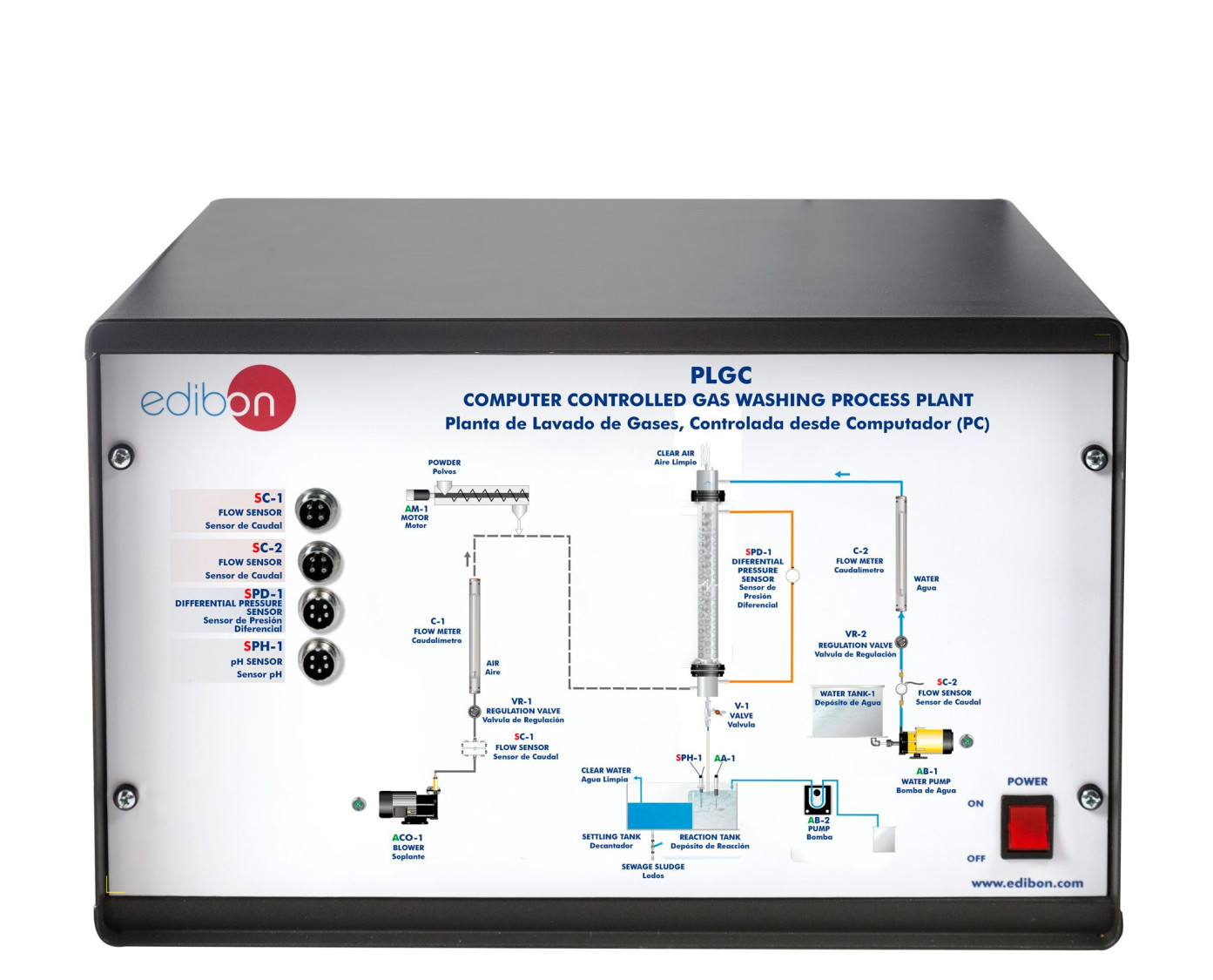 La Planta de Lavado de Gases, Controlada desde Computador (PC), "PLGC", diseñada por EDIBON, dispone de un depósito de alimentación de agua, a partir del cual y por medio de una bomba de agua, el agua es impulsada hacia la parte superior de una columna. Los sólidos se añaden por medio de un sistema de dosificación a la corriente de aire, la cual se introduce por la parte inferior de la columna. El agua que entra por la parte superior de la columna se pulveriza, por medio de unas duchas, para arrastrar los sólidos añadidos en la corriente de aire.