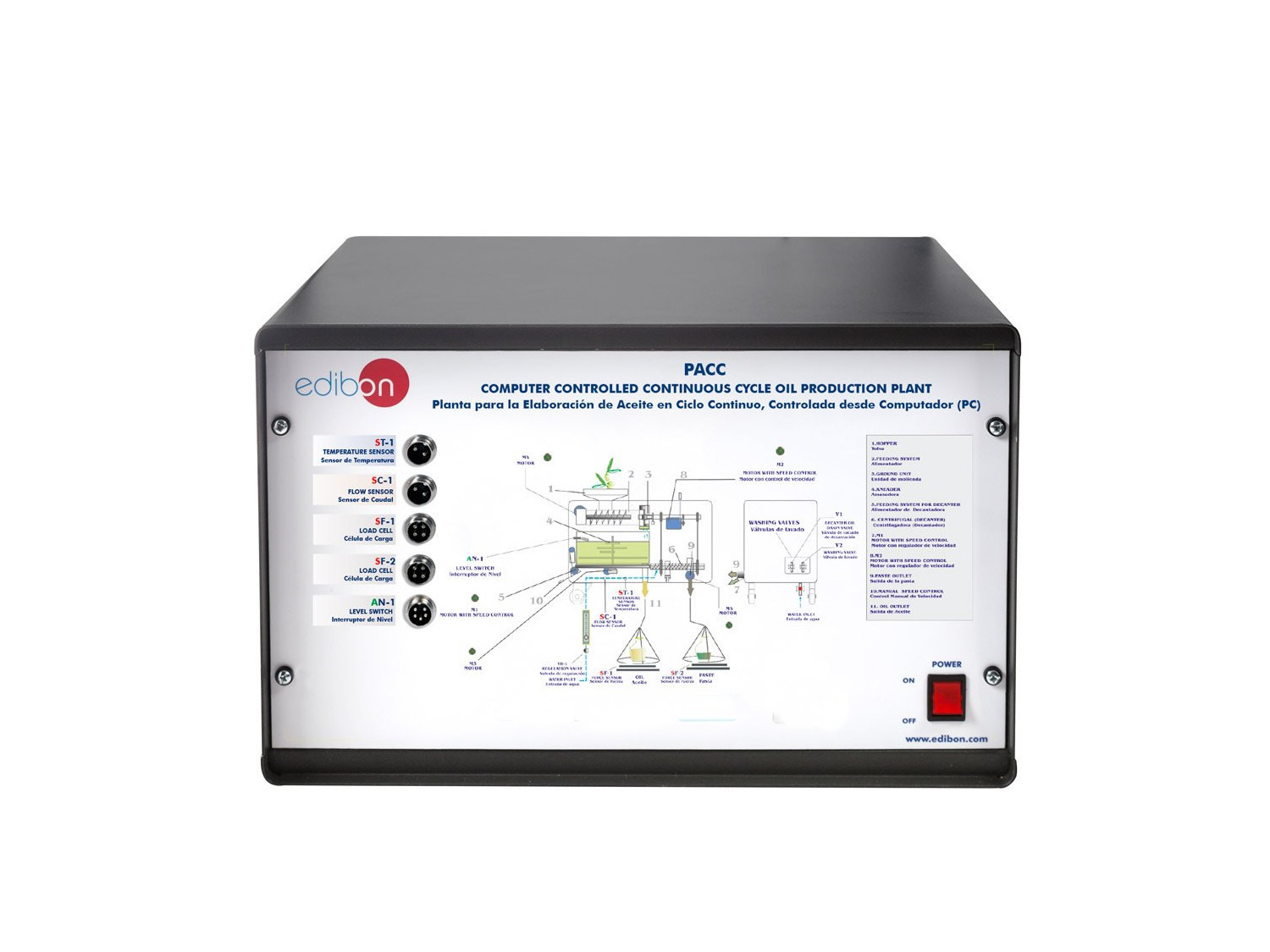 La Planta para la Elaboración de Aceite en Ciclo Continuo, Controlada desde Computador (PC), "PACC", diseñada por EDIBON, permite la enseñanza e investigación del proceso de obtención del aceite de oliva, medir la acidez del aceite, así como el estudio del rendimiento del proceso.