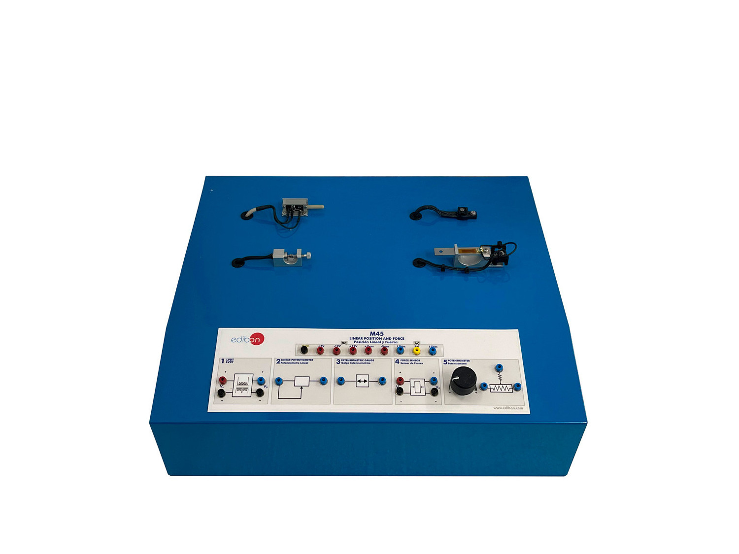 Con el equipo de Posición Lineal y Fuerza, "M45", de EDIBON, se permite estudiar el uso y aplicaciones de los transductores, sensores y sistemas de medición. Es decir, se muestran las técnicas para medir varias magnitudes físicas, como pueden ser la posición, el desplazamiento, la fuerza, etc., empleando transductores de posición lineal. Este equipo permite realizar diferentes prácticas relacionadas con sensores de posición lineal y de fuerza.