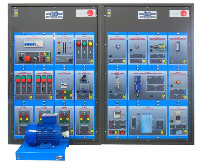 L’Application d’Opérations de Contrôle Automatiques avec des Contacteurs et des Senseurs IV, "AEL-CM4", a été conçue par EDIBON pour l’étude des opérations de commande automatique avec contacteurs et capteurs connectés à une charge (moteurs à induction, convoyeurs, éclairage, etc.).