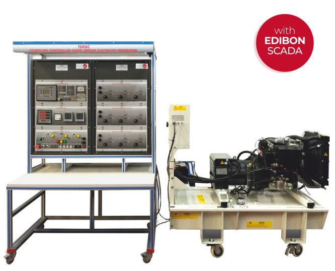 L'Application du Groupe Électrogène Diesel, Contrôlé par Ordinateur (PC), "TDEGC", a été développé par EDIBON pour réaliser des études et des recherches sur le processus de fonctionnement de centrales électriques réelles fonctionnant avec des groupes électrogènes diesel. Cette application se compose de deux parties principales : le groupe moteur-générateur et les panneaux de contrôle, de signalisation et de surveillance où sont intégrés les régulateurs, les contrôleurs, l'instrumentation et l'électronique nécessaires au bon fonctionnement de l'application.