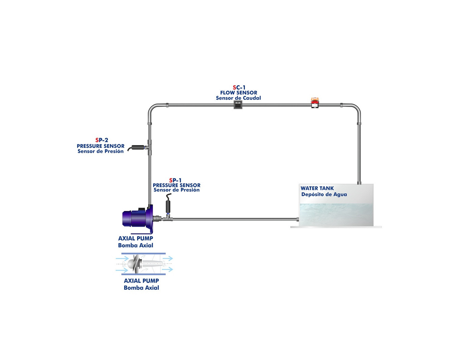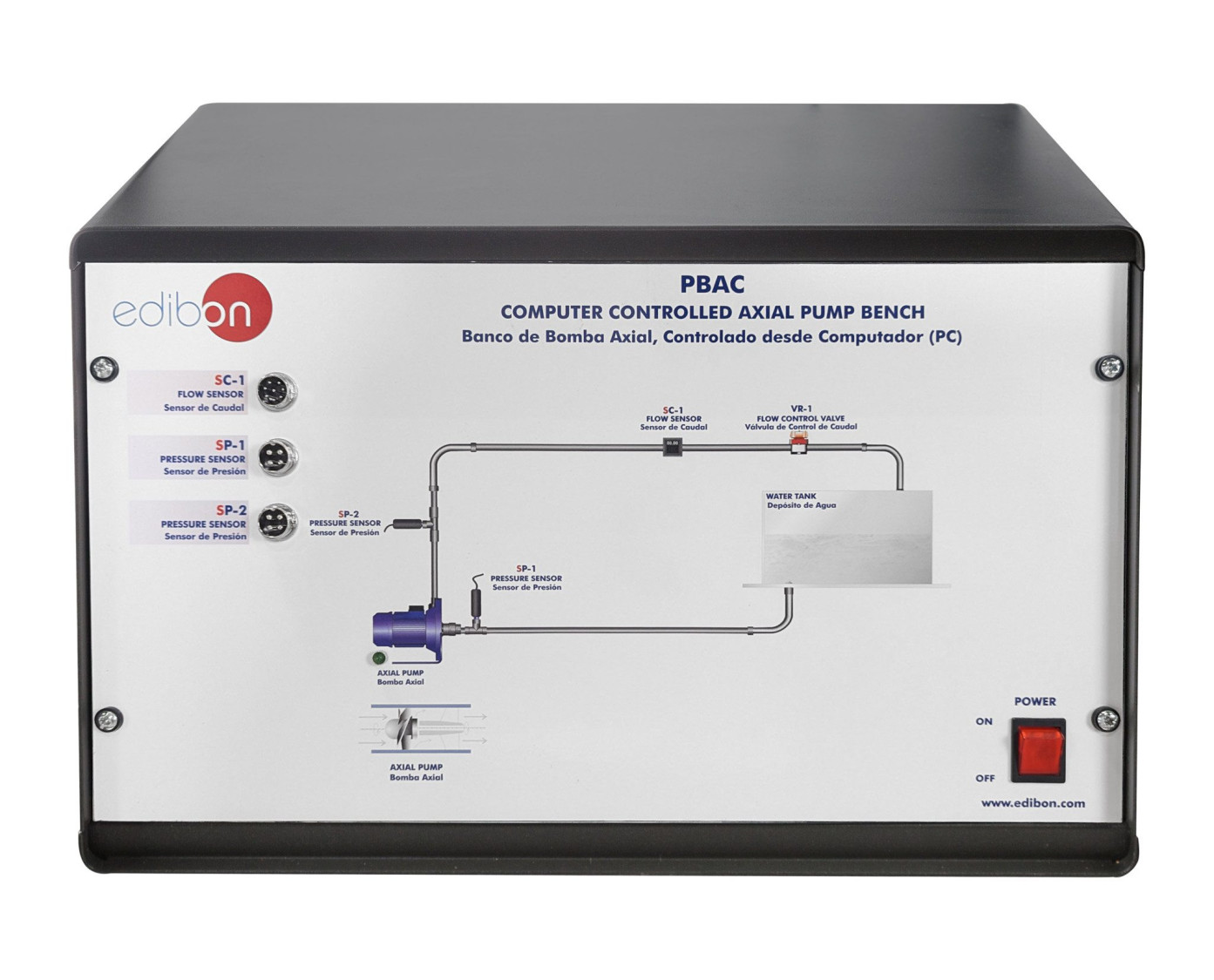 Le Banc de Pompe Axiale, Contrôlé par Ordinateur (PC), "PBAC", a été conçu par EDIBON pour étudier ce type de pompes. Il s'agit d'un unité de bureau composé d'une pompe centrifuge contrôlée par un ordinateur, d'un réservoir d'alimentation en eau, de tuyaux de circulation, de vannes de régulation, ainsi que d'éléments de contrôle suffisants pour expérimenter la pompe : deux capteurs de pression et un débit.