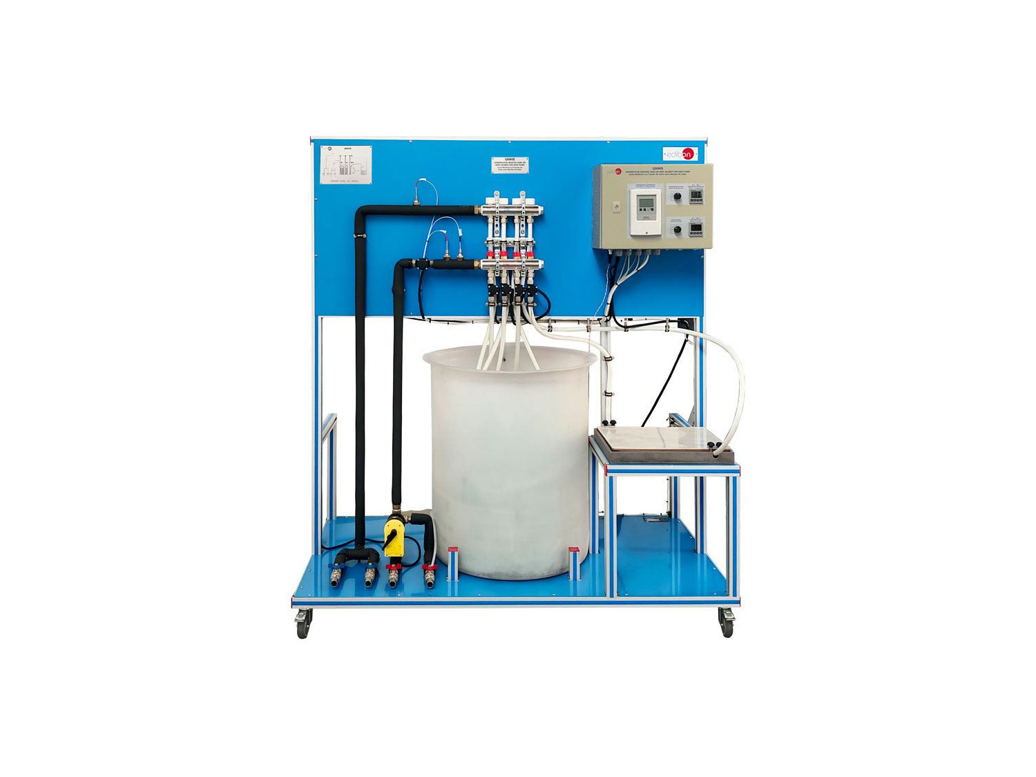 The unit allows the hydraulic study of a circuit similar to the hot water circuit in a radiant floor installation, allowing the efficiency of heat transfer and the uniformity of distribution in different configurations to be studied. The unit has a large number of temperature and flow sensors located throughout the installation to measure and record variations at different points on the floor, facilitating detailed analysis of the efficiency of the system and the identification of possible improvements. The system has a three-way valve which allows the ambient temperature control to be adjusted and visualized. In addition, the environment is simulated by means of a tank filled with water in which there are three underfloor heating circuits of different lengths, which allows the conditions that would occur in a real underfloor heating installation to be recreated with relative accuracy.