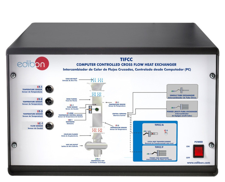 The Computer Controlled Cross Flow Heat Exchanger, "TIFCC", consists of a rectangular wind tunnel made of stainless steel, resistant to corrosion. It has a bell-shaped inlet and a central opening arranged longitudinally with two supporting elements made of stainless steel to retain the plates with the different exchangers.