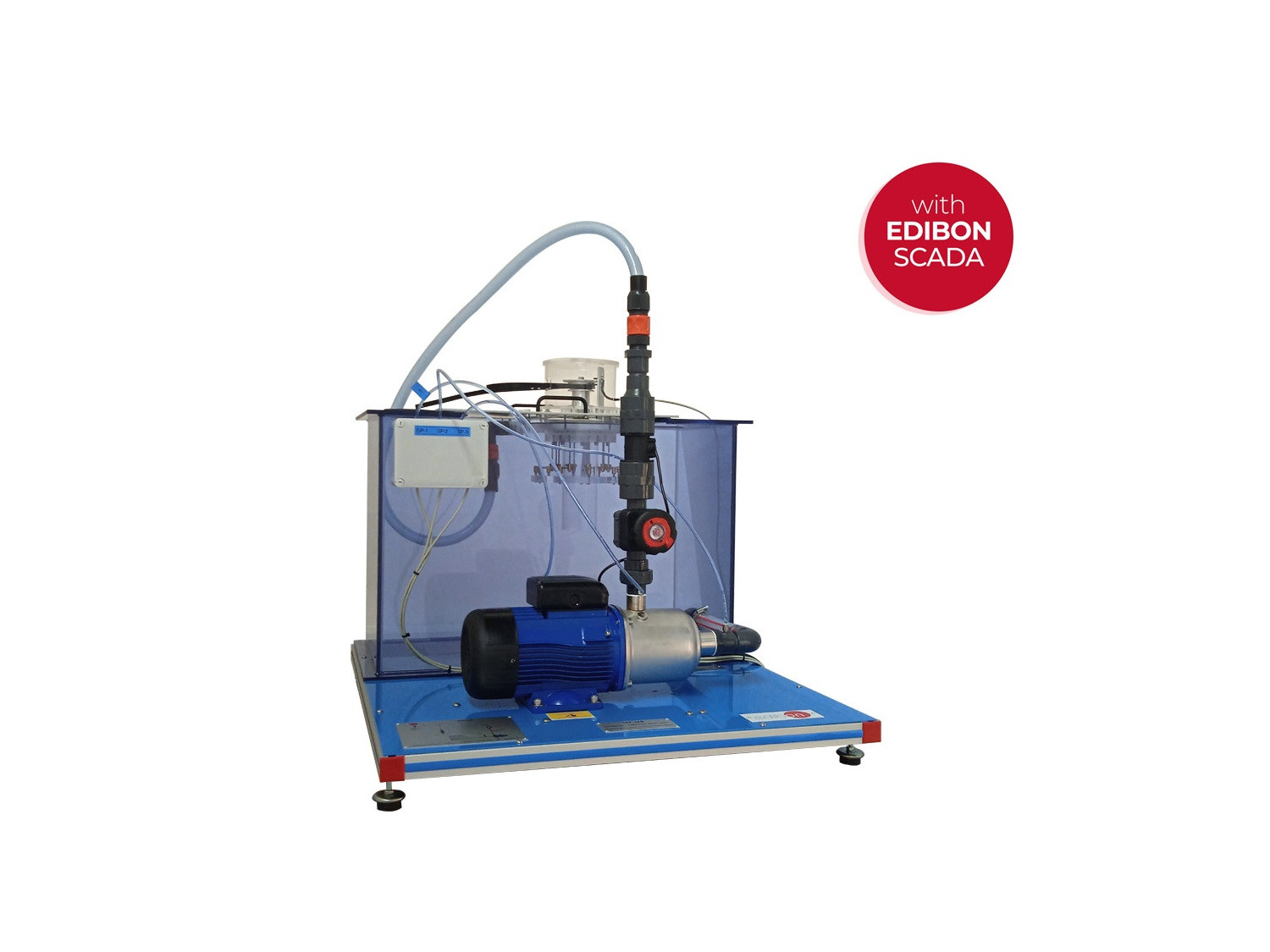 - Le groupe pompe-turbine dispose d’un réservoir et d’un système de tuyauterie qui permettent de travailler en permanence avec du fluide recirculé afin d’éviter la consommation inconsidérée d’eau.