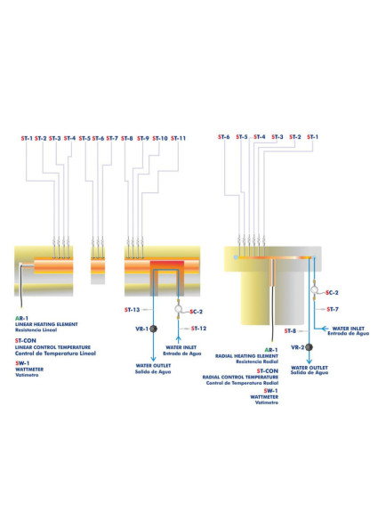 One of the modules is provided of a cylindrical metal bar for the realization of a series of experiments of linear heat conduction. While the ther one consists of a metallic disk that allows studying the radial heat conduction. Both modules are provided with a series of takings for the connection of a series of temperature sensors "T" type (high precision). To maintain the gradient of constant temperature, on a side of the modules, a cooling system has been inserted by circulating water.