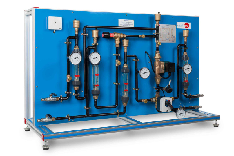 The Four-Way Mixing Valve Training Unit, "TEV4V", allows to demonstrate the function of a four-way mixing valve in a hot water heating system. The four-way mixing valve in the heating system regulates the circulation and feed flow temperatures of the water flowing in the heating system and the boiler return flow temperature.