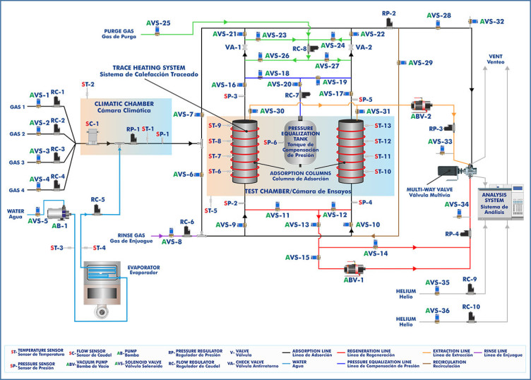 L'adsorption est un processus discontinu car lorsque l'adsorbant dans la colonne devient saturé, il est nécessaire d'arrêter le courant d'alimentation et d'effectuer la régénération du lit. Par conséquent, en ayant deux colonnes en parallèle, il est possible que l'une des colonnes effectue l'opération d'adsorption tandis que l'autre effectue la désorption. Les colonnes d'adsorption et le réservoir de compensation de pression sont placés dans une chambre climatique qui contrôle la température à laquelle l'essai est effectué.