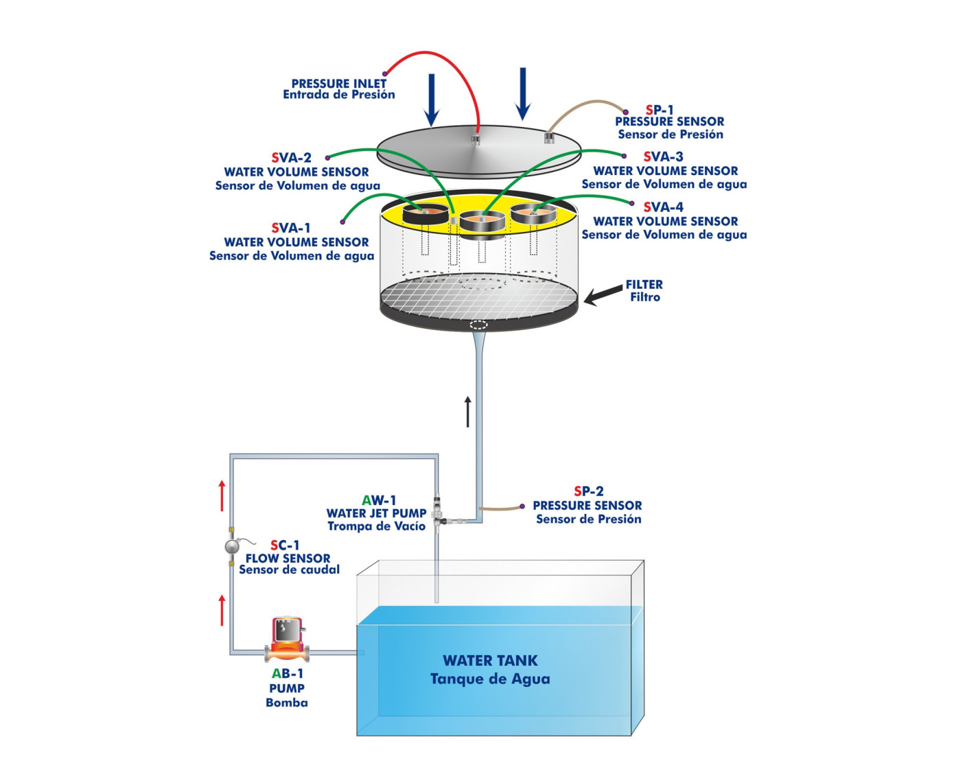 - Conteneur à sols : Il est constitué d'un réservoir cylindrique rempli de sable saturé (non fourni) qui contient trois anneaux de retenue d'échantillons de sol. A l'intérieur du sable sont placés les échantillons de sol ainsi que les capteurs de volume d'eau. Un couvercle est prévu pour éviter la perte d'eau par évaporation pendant les exercices pratiques et plusieurs filtres évitent le transport du sable vers le réservoir d'eau. Le conteneur à sols comprend un capteur de pression et une entrée d'air (entrée de pression) pour étudier l'effet de la pression atmosphérique.