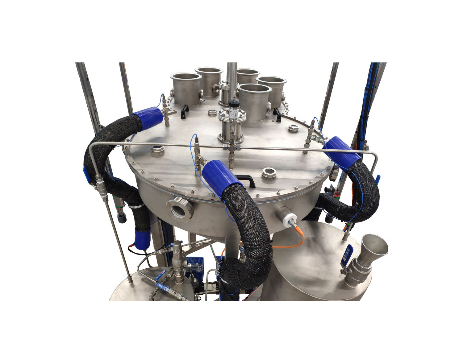 L’usine pilote comprend cinq colonnes pouvant stocker jusqu’à 18 récipients d’une capacité d’environ 200 ml, ce qui permet de charger jusqu’à 15 à 18 litres de solides. Les cuves en PTFE et en acier inoxydable sont chargées du solide avant l’opération, puis les colonnes sont remplies en empilant les cuves les unes sur les autres.