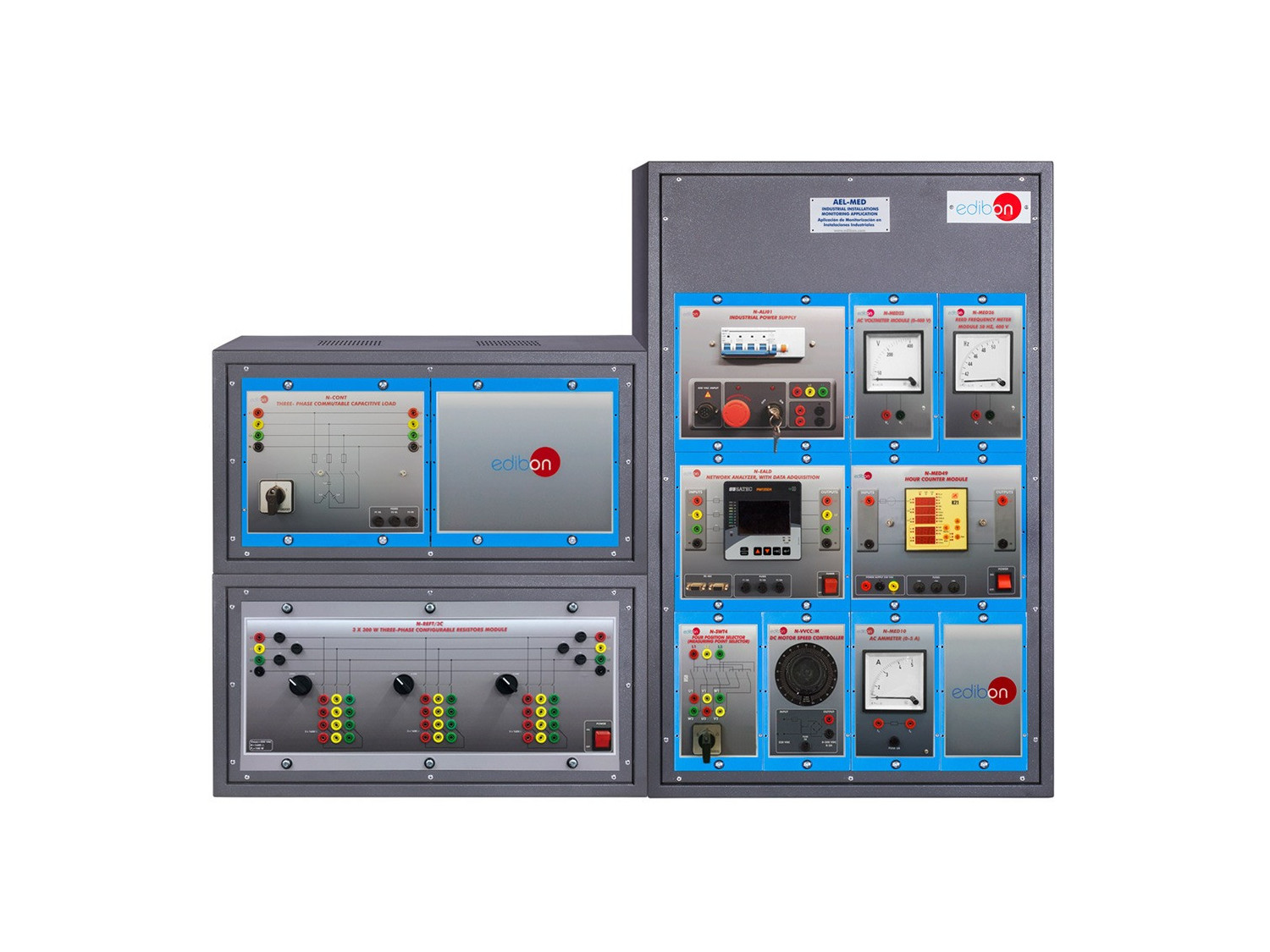 The Industrial Installations Monitoring Application, "AEL-MED", has been designed by EDIBON with the objective of introducing the consumption supervision of industrial installations. For that, the application contains the next modules: a main power supply, an alternate current voltmeter, an alternate current ammeter, a frequency meter to check the quality of the service or detect interferences, a network analyzer with active and reactive power consumption, this allow us to calculate for example the power factor in each instant, an hour counter and a four position selector to measure different points. With all of this elemnts is possible to supervise an industrial installation and announce the students the different kinds of devices used for these purposes.