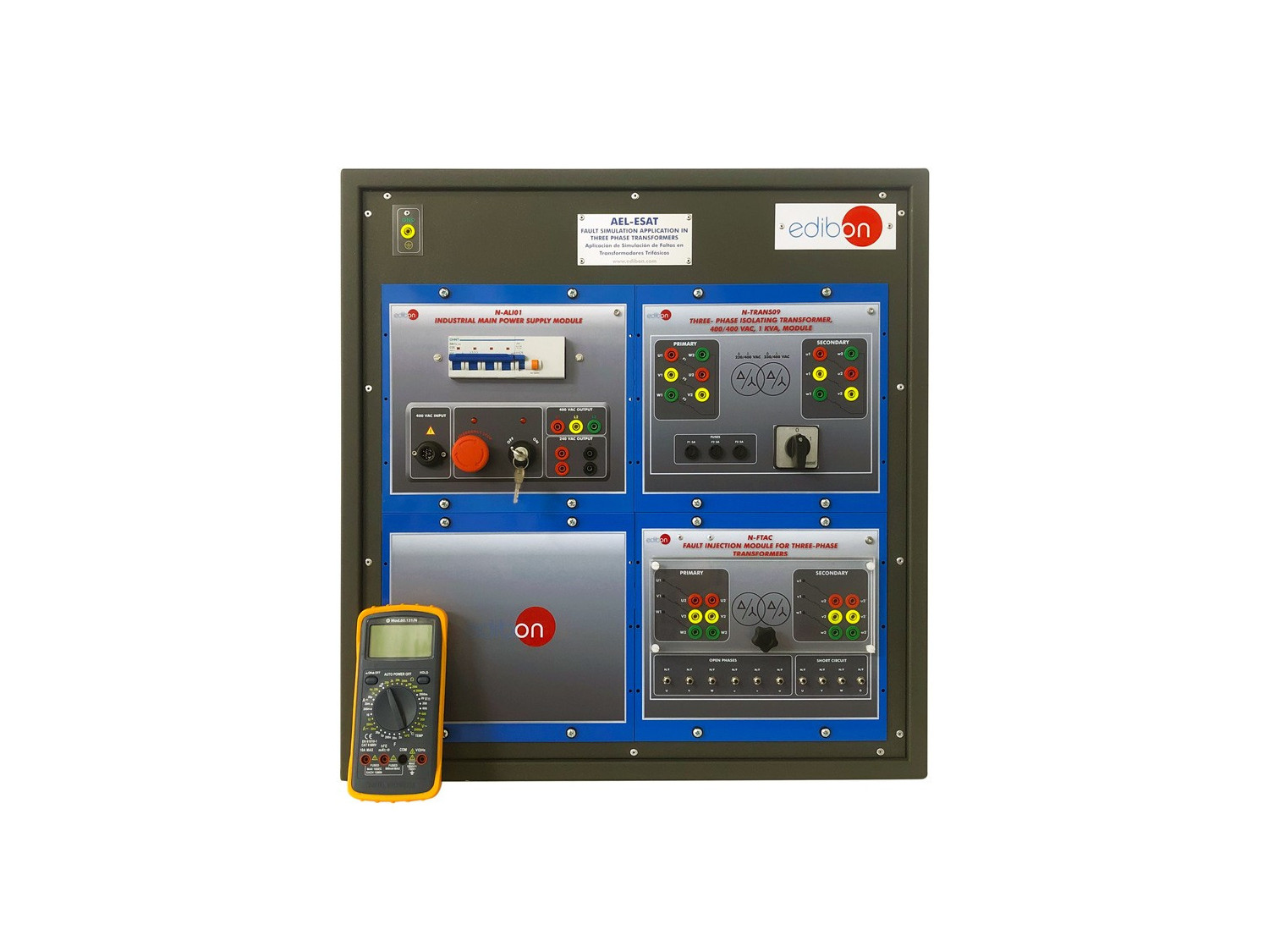 The Fault Simulation Application in Three Phase Transformers, "AEL-ESAT", has been designed by EDIBON to simulate non-destructive faults in three-phase transformers and application of diagnostic and localization techniques.